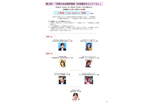 世界的日语学习者日语写作大赛是世界规模的重要日语写作赛事之一,旨在培养优秀日语人才,促进国际民间友好交流。本届比赛共收到来自66个国家和地区的9086篇参赛作品,经过评审组专家的两轮严格筛选,共评选出一等奖2人,二等奖5人,三等奖20人,努力奖30人。吴潮松同学是二等奖以上获奖者中唯一来自中国大陆的选手。