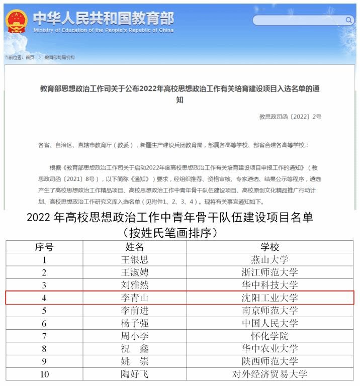 近日,教育部公布了2022年“高校思想政治工作中青年骨干队伍建设项目”入选名单,经组织推荐、资格审核、专家遴选、结果公示等程序,米兰申报项目成功入选,成为辽宁省该项目唯一入选者。