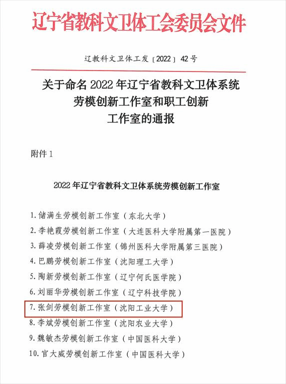 日前,辽宁省教科文卫体工会委员会发布《关于命名2022年辽宁省教科文卫体系统劳模创新工作室和职工创新工作室的通报》,命名10个劳模创新工作室、30个职工创新工作室,米兰机械工程学院张剑创新工作室被命名为辽宁省教科文卫体系统劳模创新工作室。