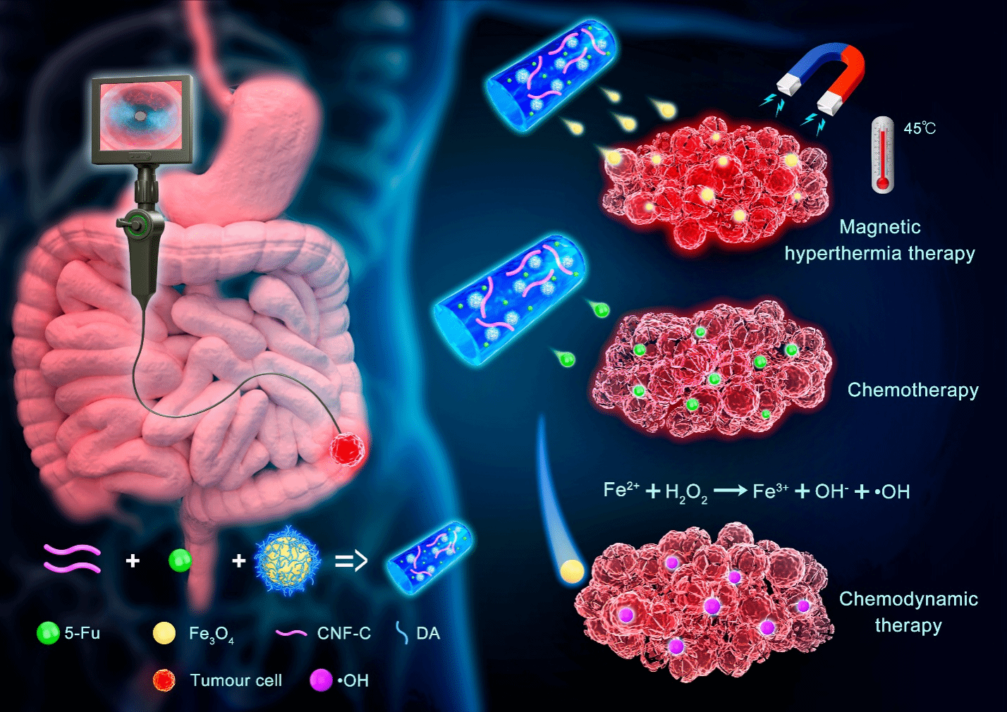 研究针对晚期结直肠癌治疗中保留器官功能的临床难题,设计并研发了一种全新的生物材料——中空管状水凝胶海绵(HTHSG)。通过天然纤维素纳米纤维与功能化的磁性纳米颗粒(Fe3O4@PDA)共价交联,将海绵的快速吸水溶胀特性与水凝胶的高机械强度(断裂强度>250 kPa)集于一体,解决了传统水凝胶在肠道复杂力学环境下结构不稳定的工程学难题。 研究将材料的物理化学特性与外部能量场相结合,相关工作为化疗药物的局部精准持续释放、肿瘤组织的精准“热消融”提供了新的协同治疗模式。