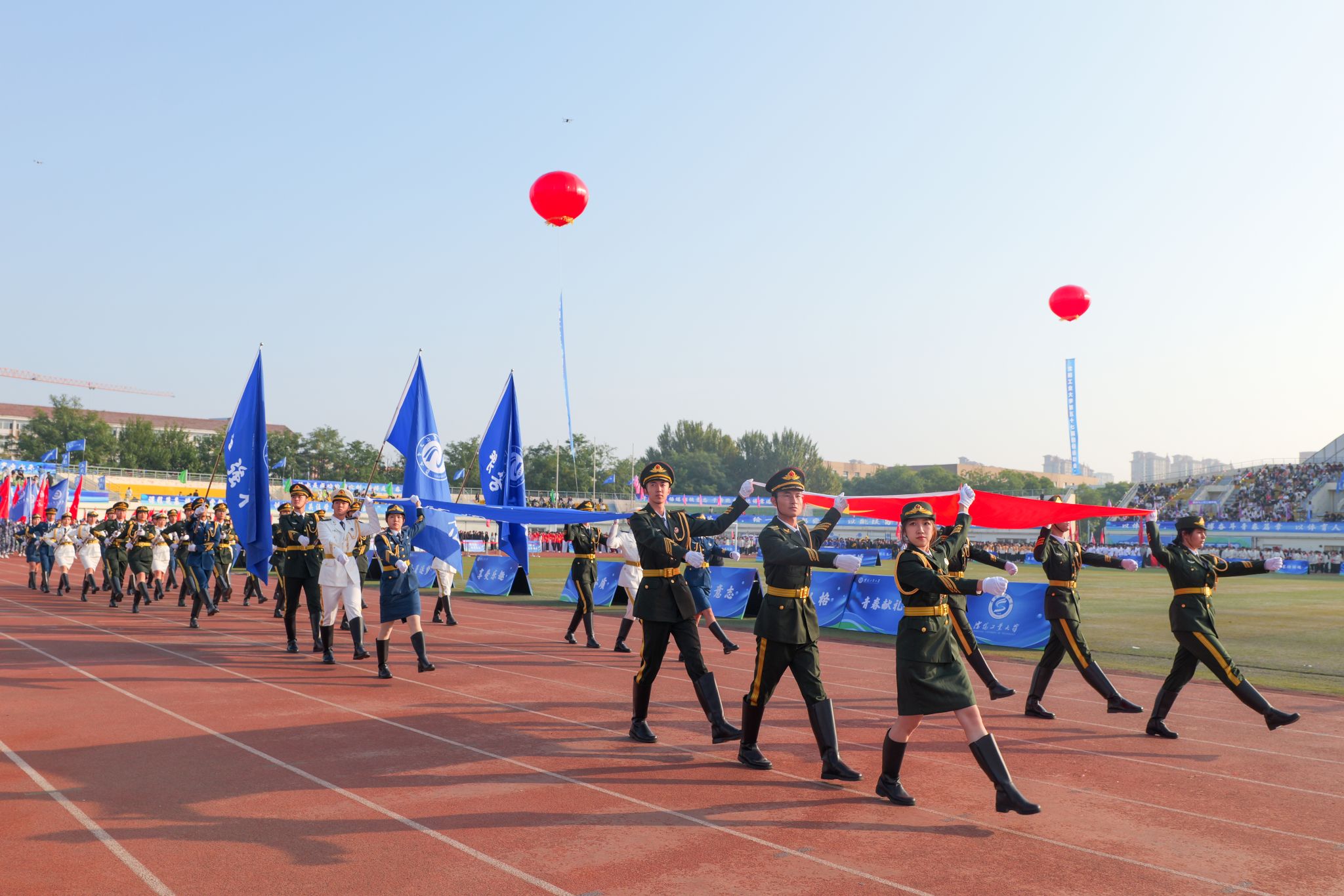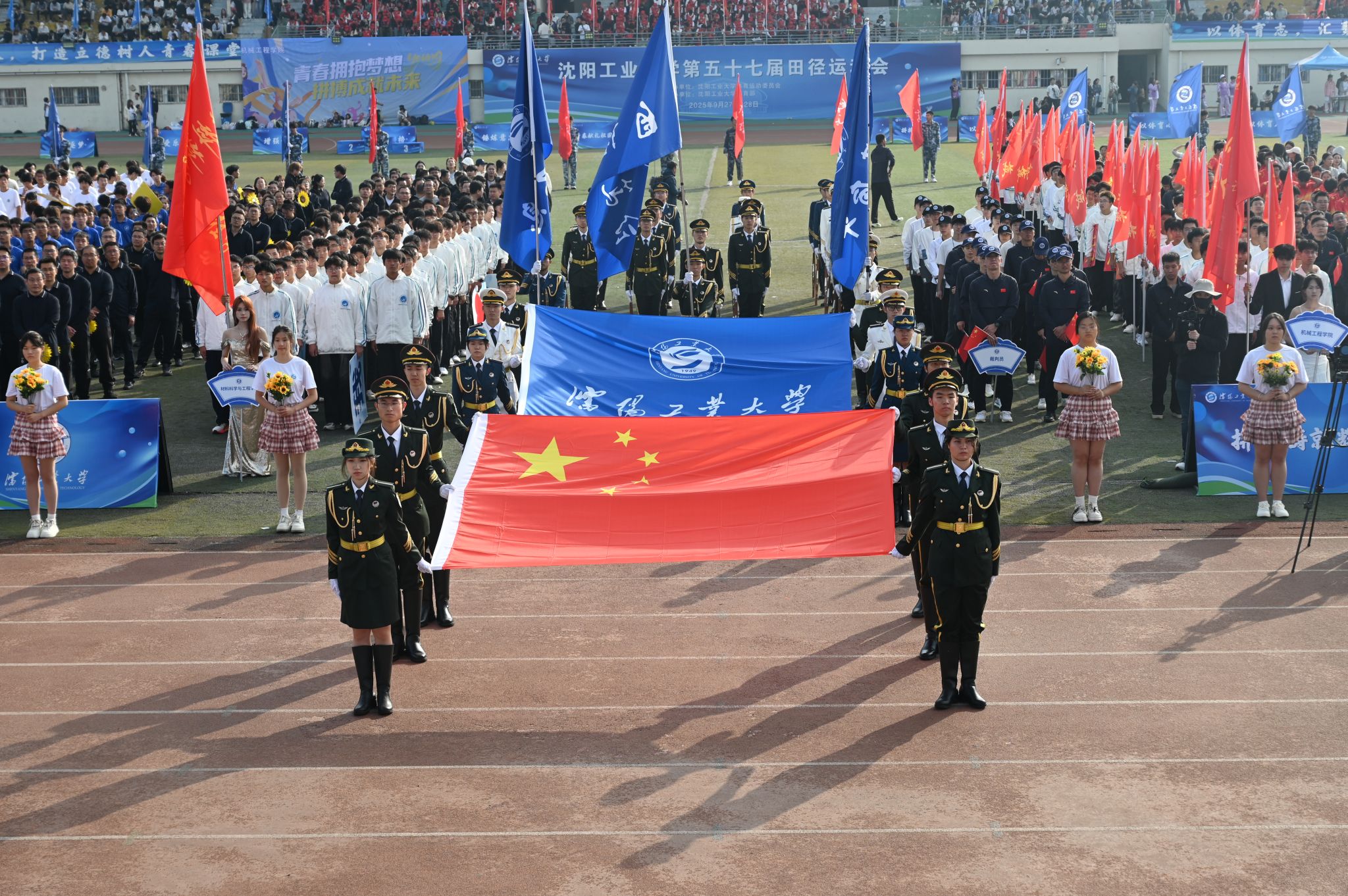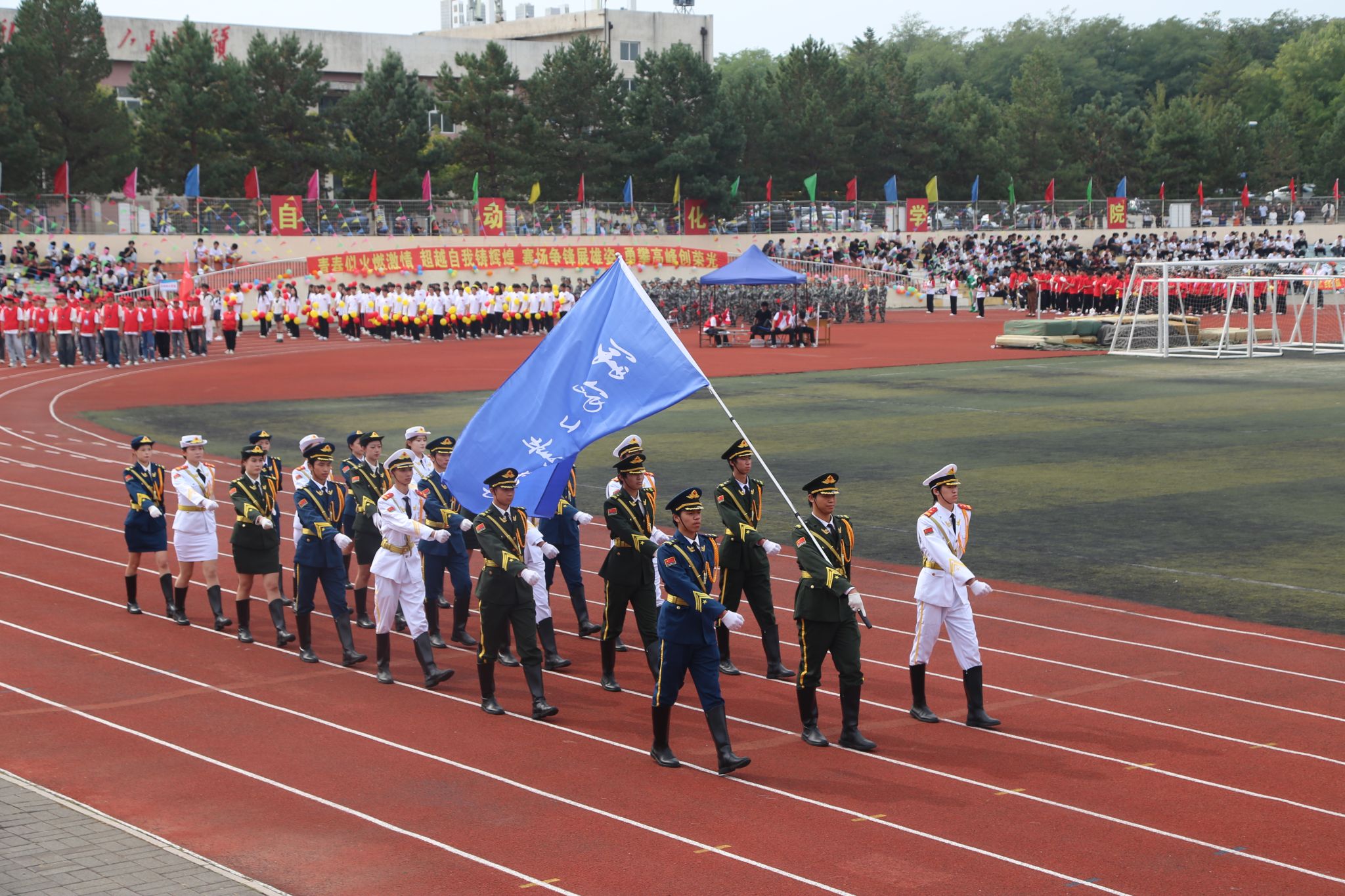 激昂雄壮的《运动员进行曲》奏响时代强音。国旗方队、校旗方队、校训方队、旗海方队、花束方队、裁判员代表队以及各单位代表队依次进入运动场。师生们活力满满,各具特色的队列造型展现学院特色,点燃全场热情。彰显出工大师生团结奋进、锐意进取的精神风貌。