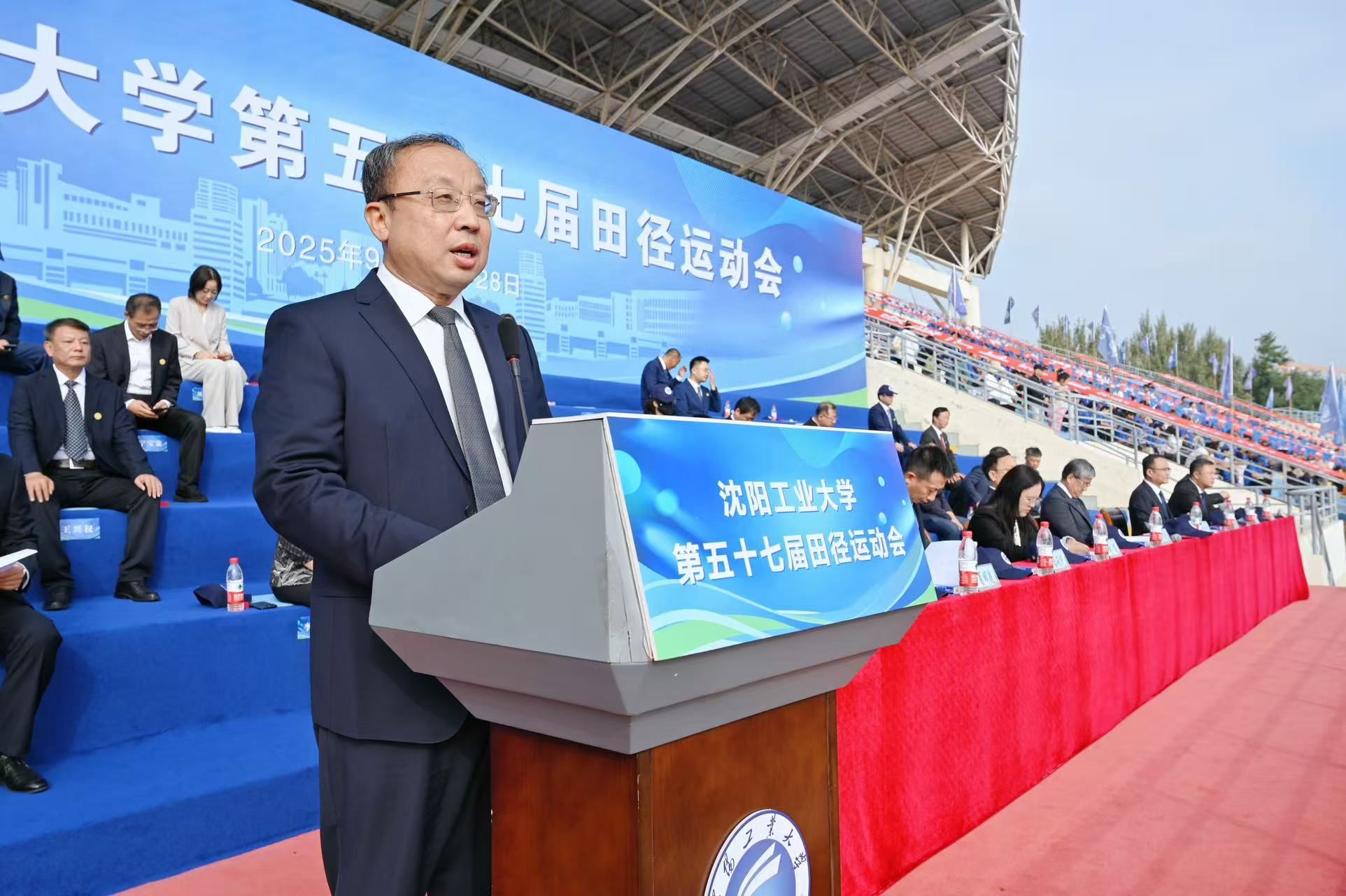 学校体育运动委员会主任、党委常委、副校长陈延明在开幕式中致辞,他代表学校向筹备本届运动会的师生和全体裁判员、运动员致以诚挚问候。陈延明指出,体育是青年绽放风采、锤炼意志的重要舞台,学校着力打造“以体育志、以体育智、以体育心、以体育人”为育人范式,将体育工作纳入立德树人全局。过去一年,学校体育事业成果丰硕,在篮球、足球、排球等赛事中屡获佳绩。他表示,希望全校上下能够践行弘扬奥林匹克精神,倡导引领健康生活方式,探索推动体教融合创新,将赛场中激发出的团队精神、创新意识和坚韧品格转化为推动学校各项事业高质量发展的生动实践,不断为学校高素质人才培养注入新的澎湃动能。