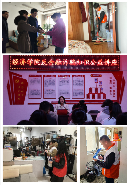 签约仪式后,经济学院师生党员和中央大街社区党员共同开展“学雷锋当先锋”主题党日活动。党员们分四组,为社区居民开展反金融诈骗公益知识讲座、走访慰问社区低保户、对居民电动车使用情况进行登记,并通过派发“电动自行车违规停放充电法律责任”宣传单等方式向居民及商户普及消防安全知识,为营造健康幸福、安全有序社区环境贡献力量。