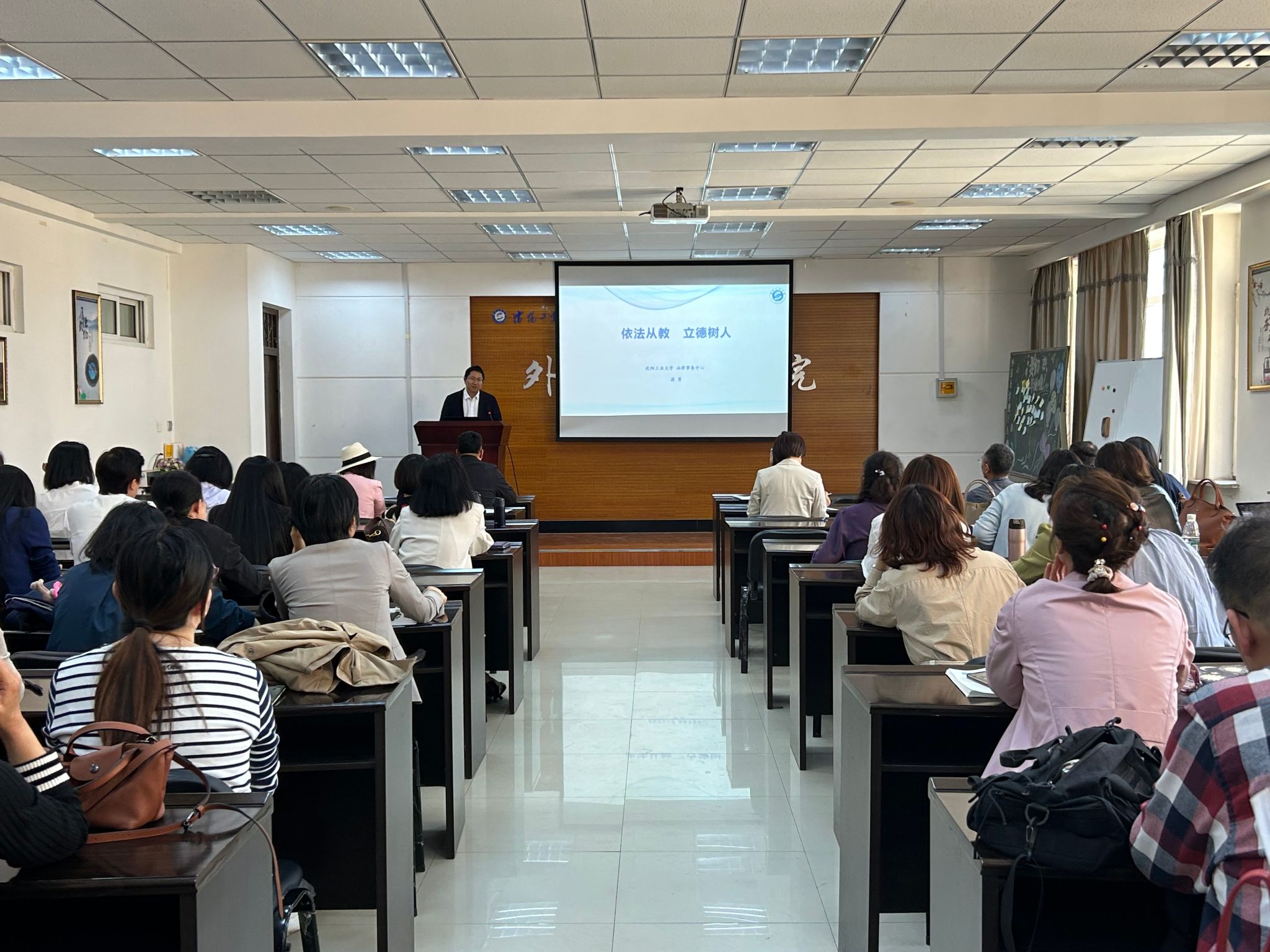 为扎实开展党纪学习教育,培育良好师德师风,5月8日,外国语学院党总支在文科楼419会议室开展“依法从教 立德树人”专题报告会,会议由党总支书记杜振君主持,学院全体教职工参加。