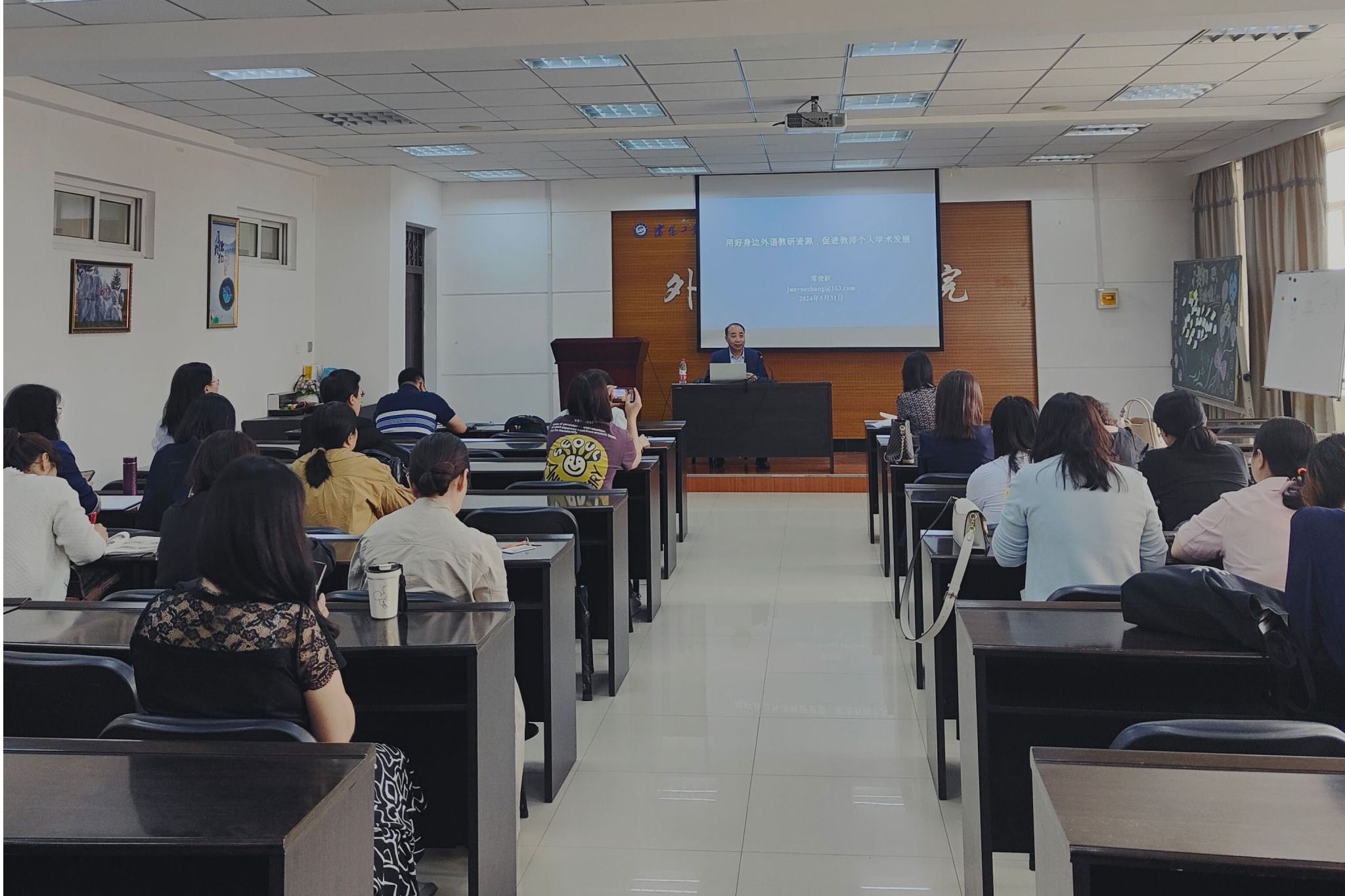 常俊跃教授首先作了题为“用好身边外语教研资源,促进教师个人学术发展”的学术报告。报告在梳理国内外外语教育理念变革的基础上,阐述关注现实问题、思考现实问题、探索解决现实问题在外语教师发展乃至在外语教育发展中的价值。常教授通过典型案例,展示了问题驱动开展外语教育教学研究的方法和实践。