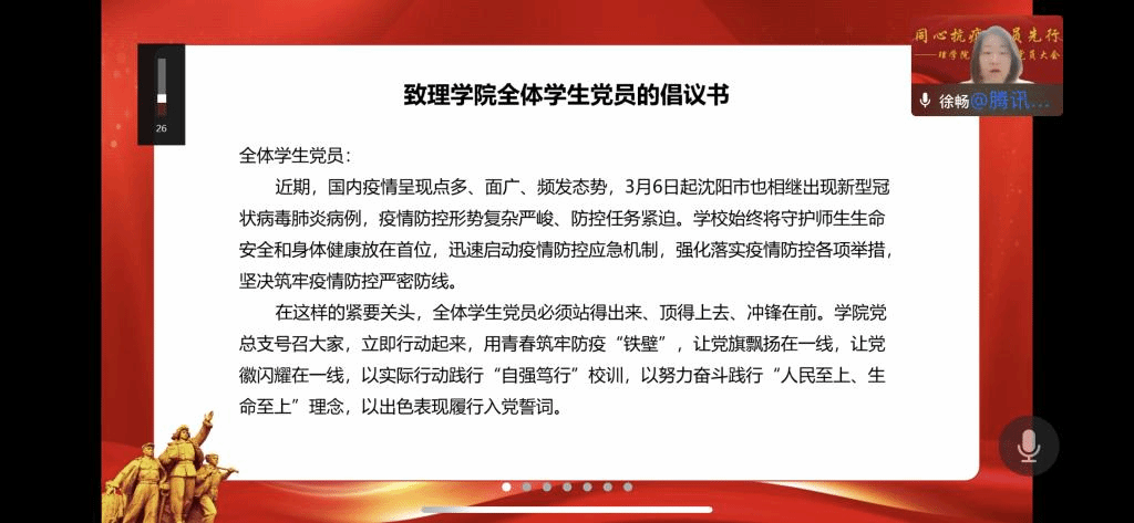 活动中,理学院团委书记兼学生工作办公室主任、研究生党支部书记徐畅首先宣读了《致理学院全体学生党员的倡议书》,并播放了学院疫情防控工作集锦视频。随后李媛媛以“树立共产党员应有的样子——平常时候看得出来、关键时刻站得出来、危难关头豁得出来”为题,通过描绘出不同时期共产党员的光辉英勇事迹,号召全体党员要始终保持共产党员的政治本色和光辉形象,并提出四点要求:增强大局意识,带头坚决贯彻部署要求;增强纪律意识,带头执行学校管理规定;增强防护意识,带头做好个人安全防护;增强责任意识,带头发挥先锋模范作用。
