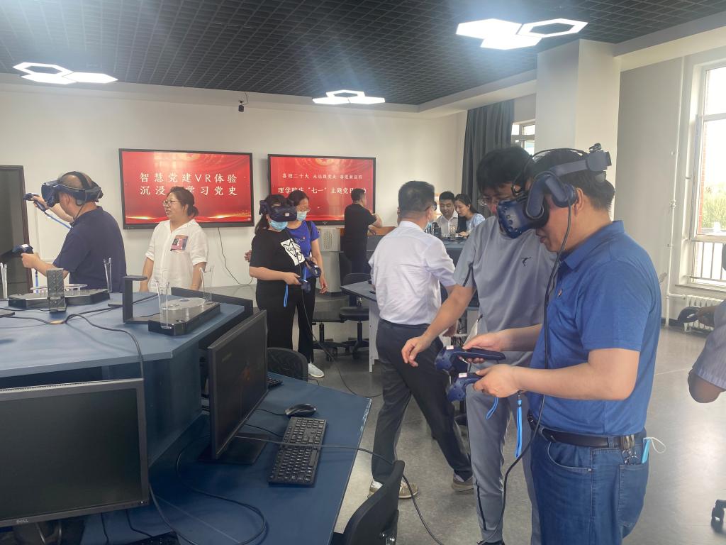 7月1日,理学院党总支充分发挥学院资源优势,在大学物理实验中心虚拟仿真实验室内举办“智慧党建VR体验 沉浸式学习党史”活动,党员们通过VR技术畅游全景“党史馆”,实景感受“飞夺泸定桥战役”、“狼牙山五壮士”和“长征雪山”等虚拟仿真场景,实景感受曾经的筚路蓝缕,亲身体验艰苦的斗争岁月。创新的学习教育形式,既有“党味”又有“情味”,既有“鲜味”又能“回味”,不仅激发了学习兴趣,也增强了教育效果。此外,理学院党总支还邀请了辽宁省委党史研究室科研规划部部长王全有以“学习百年党史弘扬伟大建党精神”为题讲授党课,召开党员代表座谈会,共学习、话初心、谋发展。