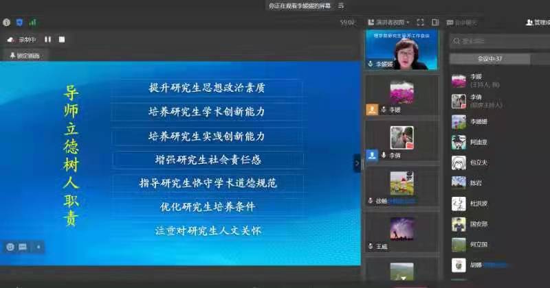 4月7日,理学院召开了全体研究生导师工作线上会议。学院领导班子全体成员、全体研究生导师、辅导员以及教学秘书参加会议。会议由学院党总支书记李媛媛主持。