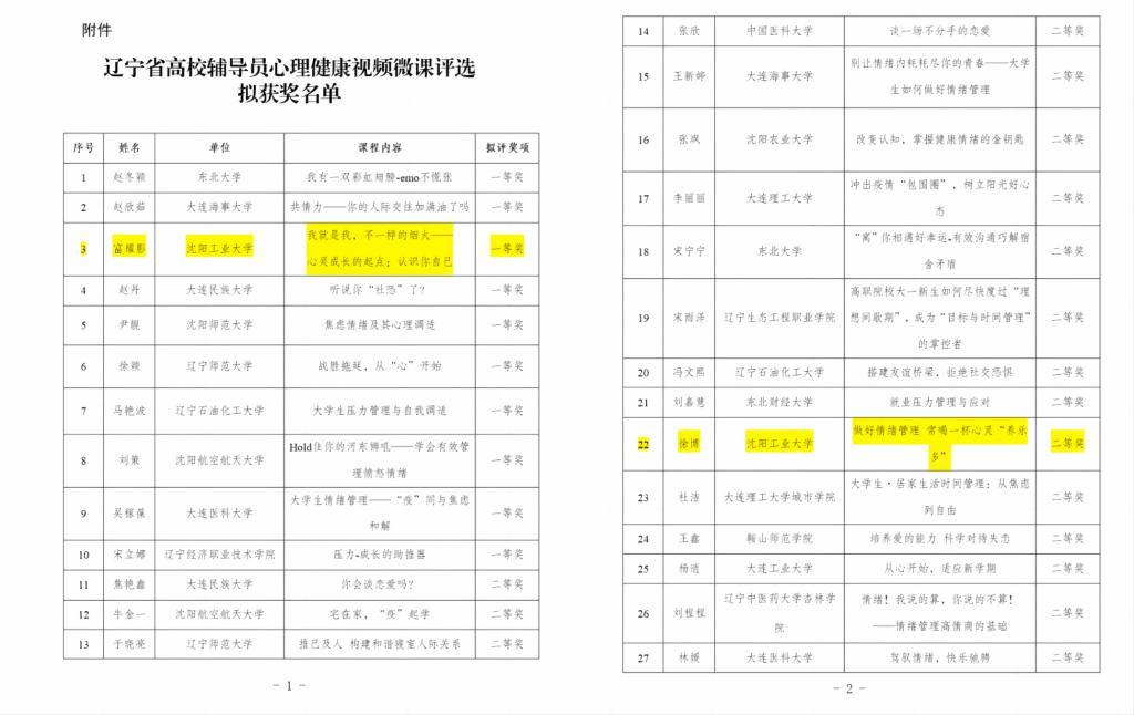 近日,辽宁省教育厅公布了辽宁省高校辅导员心理健康视频微课评选获奖名单,米兰辅导员富耀影的作品《我就是我,不一样的烟火——心灵成长的起点:认识你自己》、徐博的作品《做好情绪管理常喝一杯心灵“养乐多”》分别荣获一等奖、二等奖。