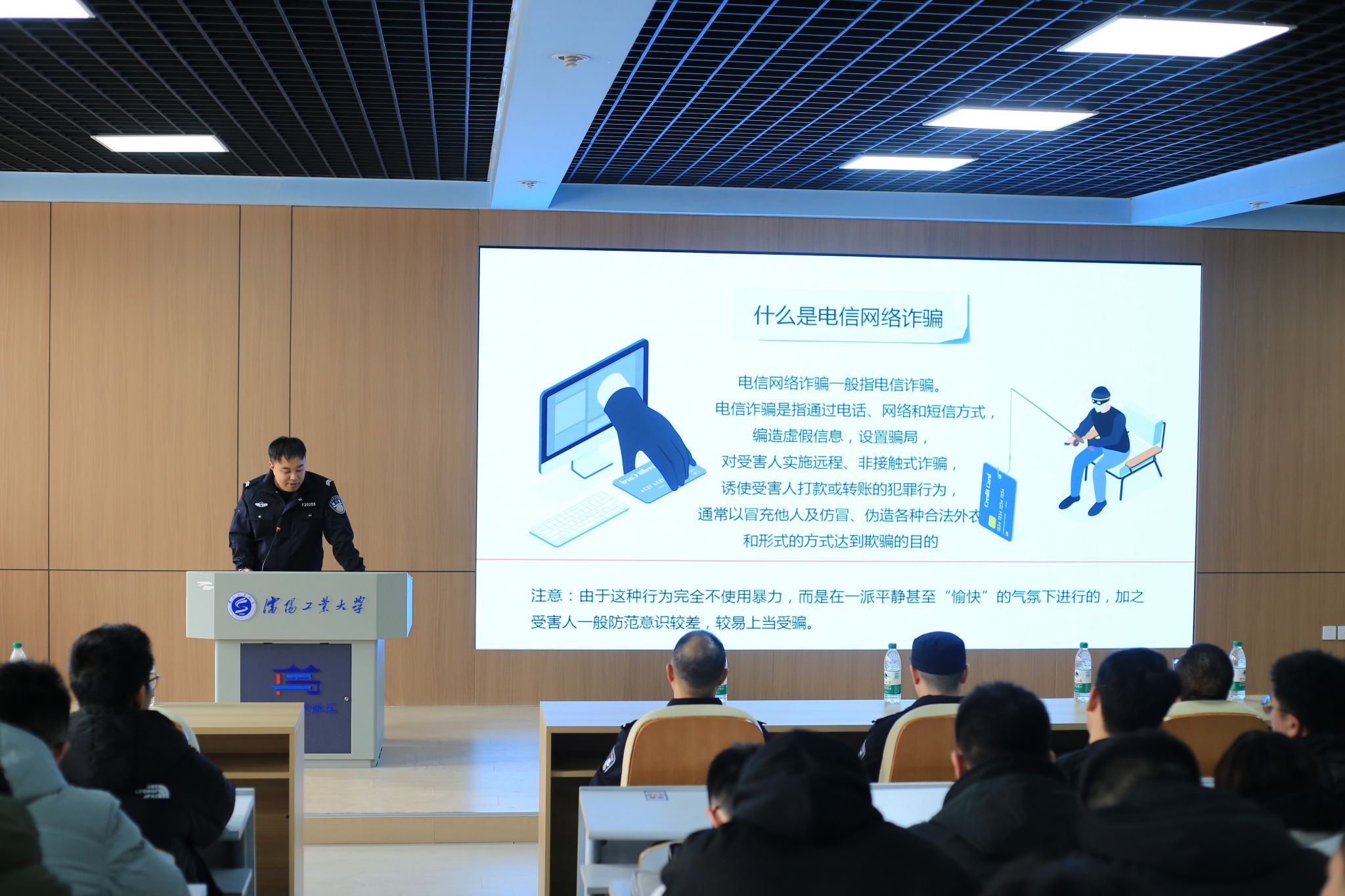党委保卫部(公安处)同学生处、后勤集团等部门,于3月5日至3月12日开展“防范于心、反诈于行”的反诈宣传周系列活动。活动利用“平安沈工大”公众号等新媒体向全校师生推送防范电信网络诈骗相关知识,并通过食堂等人员密集场所的LED公屏播放防范电信网络诈骗相关内容,同时党委保卫部(公安处)将深入学生,结合实际情况召开防范电信网络诈骗主题班会。