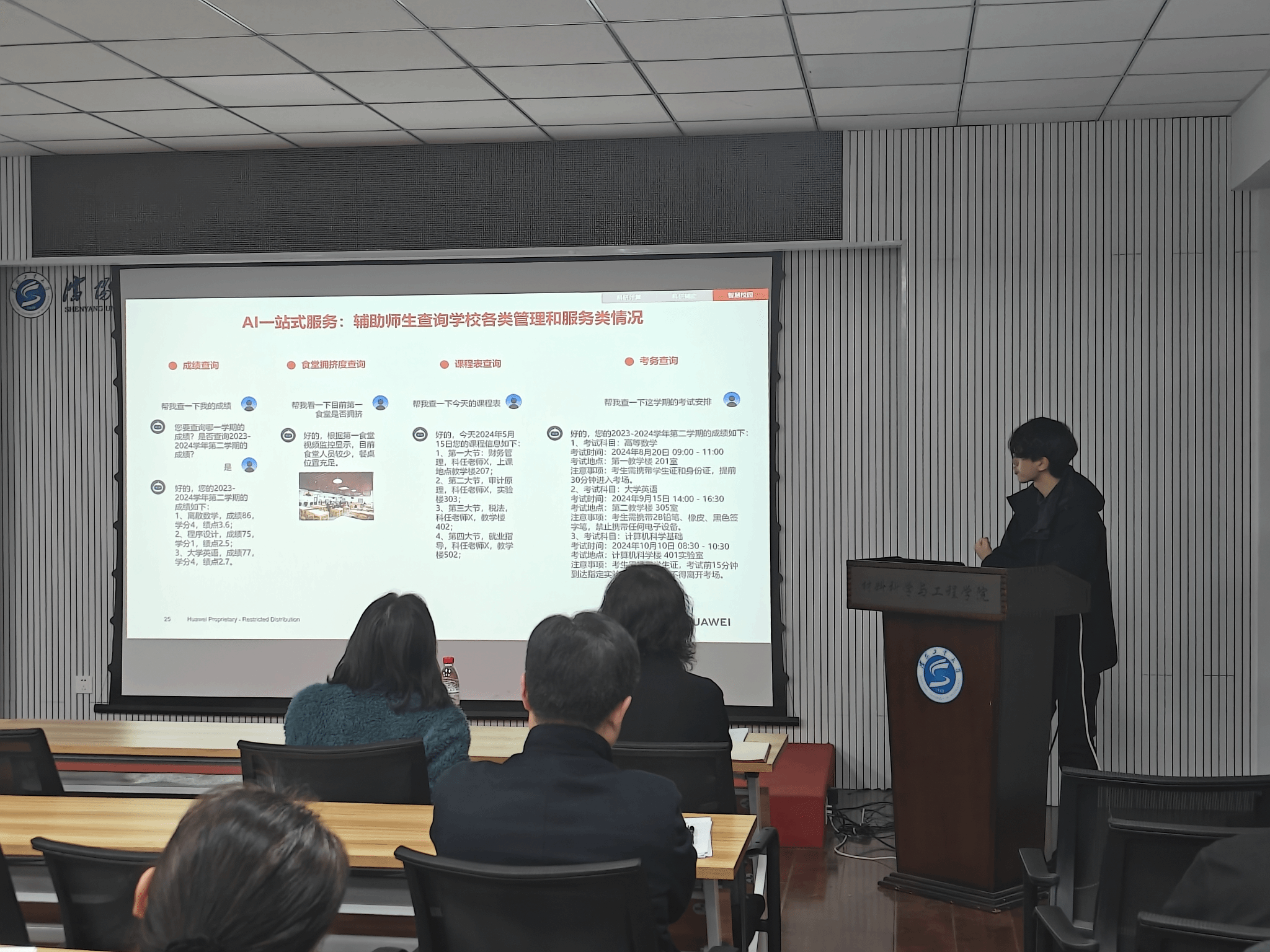学院邀请了华为教育行业解决方案工程师赵艺博作题为“AI赋能高校发展”的专题辅导报告,他从聚焦教育场景需求,打造智慧校园、AI赋能教育教学、AI助力科研和推动教育与AI深度融合等多个方面作了精彩的讲解。