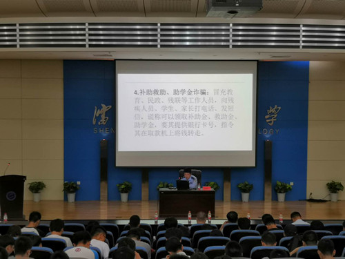 为了提高大家识别和防范电信网络诈骗的能力,切实做好大学生防范电信网络诈骗的宣传教育工作,根据“米兰milan官方网站2019年‘人人懂安全,安全护人人’安全教育活动月工作方案”的部署,党委保卫部(公安处)、学生处联合沈阳市公安局经济技术开发区分局翟家派出所,于5月28日在米兰举办2019年防范电信网络诈骗专题讲座。经济技术开发区公安分局翟家派出所副所长贾涛、翟家派出所米兰milan官方网站管区民警警官沈广盟、公安处处长李杰、学生处副处长顾晓涛、公安处副处长张琼琼、各学院辅导员老师及400余名学生代表参加活动。