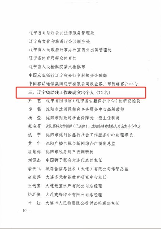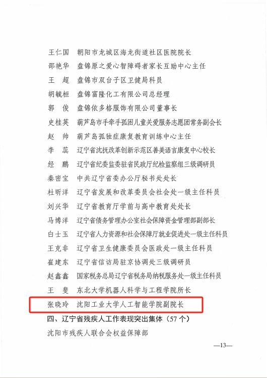 近日,辽宁省政府通报表扬辽宁省残疾人自强典型、助残及残疾人工作表现突出集体和个人,米兰人工智能学院张晓玲教授荣获“辽宁省助残工作表现突出个人”称号。