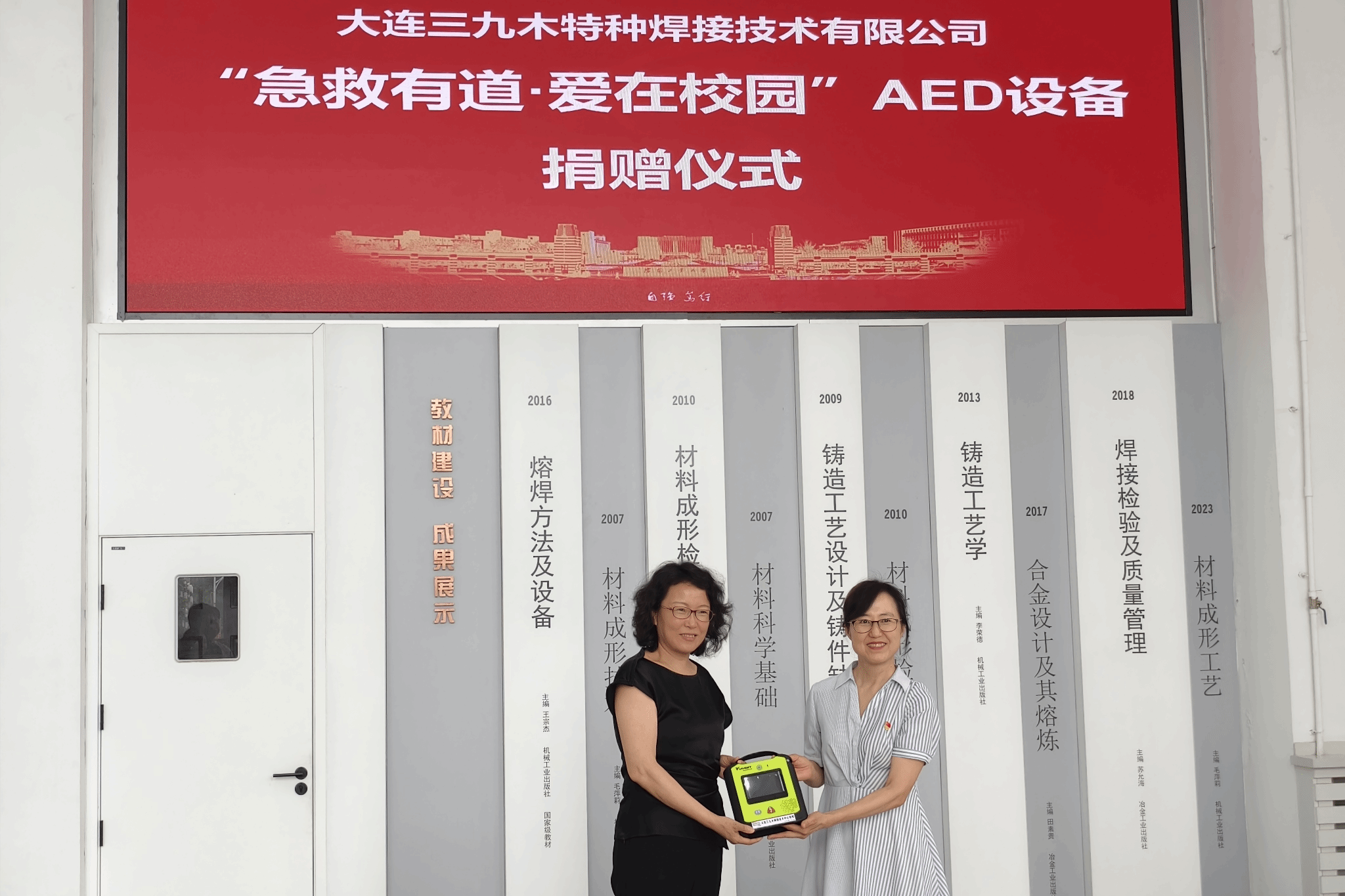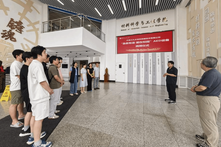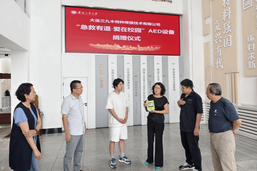 7月3日,材料科学与工程学院举行“急救有道,爱在校园”AED设备捐赠仪式。大连三九木特种焊接技术有限公司慷慨捐赠,彰显社会责任与对教育事业的关怀,为校园安全添保障。大连三九木公司总经理裴蕾、业务经理刘兵,材料学院党委书记董润芸、副书记兼副院长张驰,材料学院的师生代表共同出席了捐赠仪式。