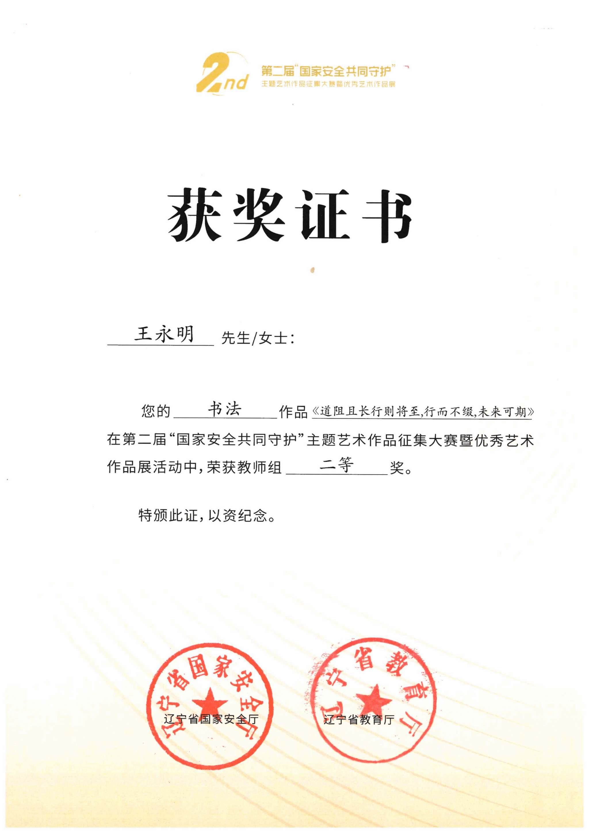 近日,在第二届“国家安全共同守护”主题艺术作品征集大赛暨优秀艺术作品展活动中,米兰因组织有力、参与踊跃,获评“优秀组织奖”,充分展现了学校在文化育人与国家安全宣传教育中的积极作为。学校教师王永明创作的书法作品《道阻且长行则将至,行而不缀,未来可期》凭借深刻的主题内涵与精湛的艺术表现力,荣获二等奖。