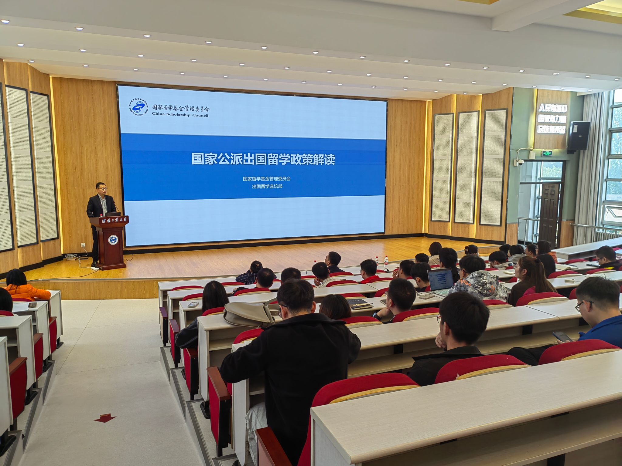 为帮助学校师生更好了解国家公派出国留学政策,推动2024年国家公派出国留学项目的顺利实施,10月18日下午,学校在教学楼E301举办“2023年国家公派出国留学政策”宣讲会。会议邀请国家留学基金委出国留学选培部项目主管刘大伟老师进行政策解读并现场答疑。国际合作处工作人员及200余名师生参加会议。国际合作处处长王亚光主持宣讲会。