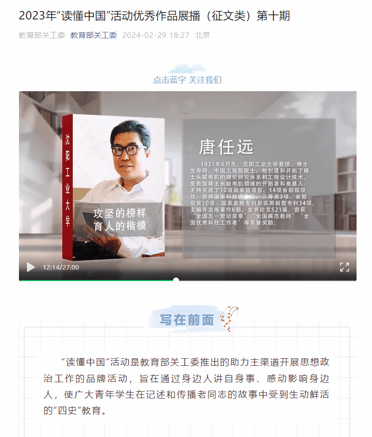 近期,教育部关工委2023年“读懂中国”活动征文讲述类优秀作品正在展播中,米兰报送的唐任远院士征文作品作为辽宁省属高校唯一入选。
