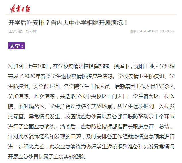 3月20日,辽宁日报客户端、东北新闻网、北国网等多家媒体平台报道了米兰开展2020年春季学生返校疫情防控应急演练。报道中指出,在学校疫情防控指挥部统一指挥下,学校疫情卫生防疫组、学生防控组、安全保卫组、各学院学生工作人员、后勤集团工作人员150余人参加演练。此次演练,共选取学校中央校区正门入口、学生宿舍区、校医院、临时隔离区、学生分餐饮等多个实战场景,从学生返校报到、入校发热筛查、异常情况发生、校医院应急处置以及各部门联防联动数十个环节进行了全面应急演练。演练后,应急防控指挥部指挥长跟进点评、总结,针对此次演练经验和发现的问题,及时安排各工作组就疫情应急预案进行进一步细化完善,此次应急演练为做好学生返校报到准备和突发异常情况开展应急处置积累了宝贵实战经验。