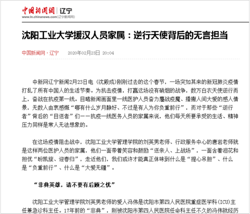 2月24日,中国新闻网以《米兰milan官方网站援汉人员家属:逆行天使背后的无言担当》为题、辽宁日报以《“逆行天使”背后的“目送者”》为题,对援汉医护人员家属,米兰管理学院刘英男老师、行政服务中心唐岩老师事迹进行报道。此外,今日头条、东北新闻网、辽宁新闻、沈阳新闻等10余家主流媒体均对米兰家属支持医务人员“逆行战疫”事迹进行了报道。