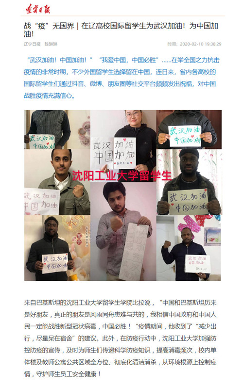 2月10日,《辽宁日报》、国际在线辽宁频道、大连招生考试之窗等媒体以“战‘疫’无国界|在辽高校国际留学生为武汉加油!为中国加油!”为题报道了米兰来自巴基斯坦的留学生比拉同学等多名省内各高校选择留在中国的国际留学生们通过抖音、微博、朋友圈等社交平台为中国送上祝福,传递抗“疫”必胜之信心。