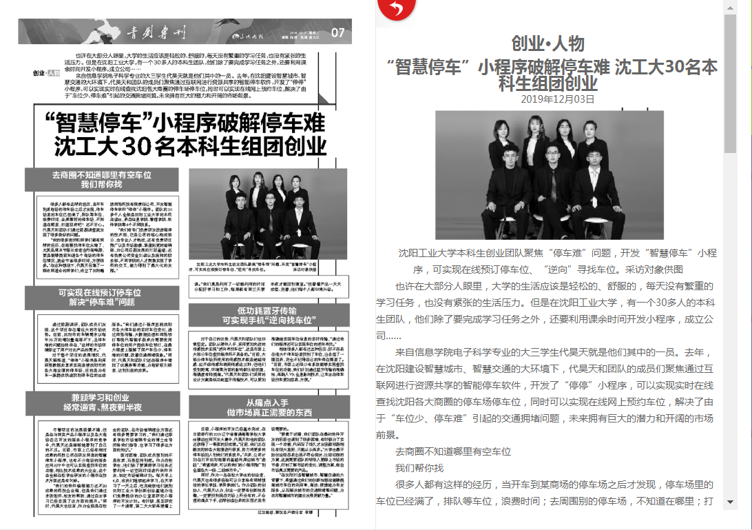 《辽沈晚报》12月3日以“‘智慧停车’小程序破解停车难 沈工大30名本科生组团创业”为题报道米兰学生创业团队,在沈阳建设智慧城市、智慧交通的大环境下,团队负责人、信息学院代昊天同学和团队成员聚焦互联网资源共享的智能停车软件,开发了“停停”小程序,以实现实时在线查找沈阳各大商圈的停车场或停车位,同时可以实现在线网上预约车位,解决了因“车位少、停车难”引起的交通拥堵等问题,未来将拥有巨大的潜力和广阔的市场前景。团队成员表示,在项目创办过程中,团队集体得到了全方位的锻炼和创新性思维的培养提升,在多学科交叉环境下,统筹谋划能力和团队协作能力得到了大幅提升,为未来创新创业的进一步实践打下坚实基础。