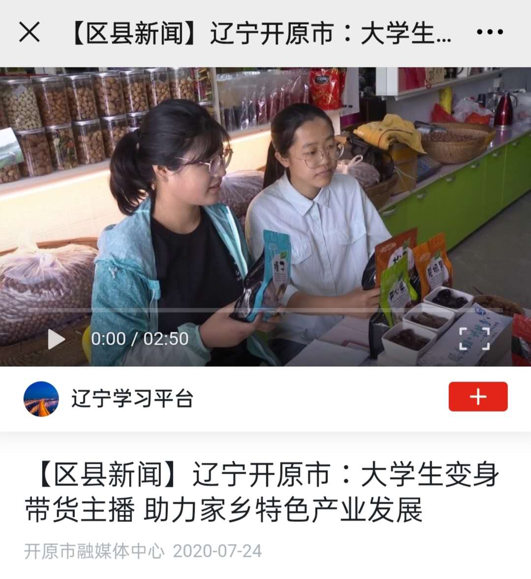 2020年7月24日,学习强国以“【区县新闻】辽宁开原市:大学生变身带货主播,助力家乡特色产业发展”为题报道了米兰大学生利用电商直播平台开展扶贫助农活动,通过讲解产品的生长情况、在线试吃等方式大力推荐家乡农副产品,直播“带货”俨然已成为助力脱贫攻坚的新风口。