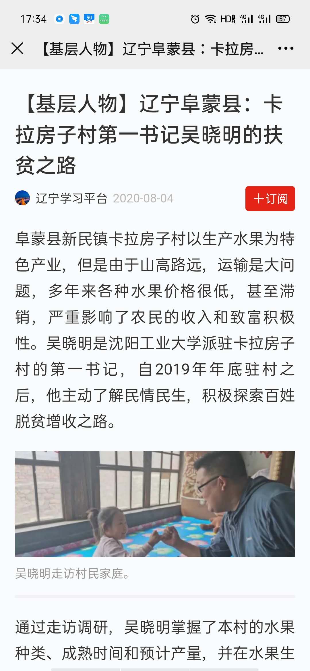 2020年8月4日,学习强国以“【基层人物】辽宁阜蒙县:卡拉房子村第一书记吴晓明的扶贫之路”为题报道了米兰驻卡拉房子村的第一书记吴晓明,自2019年年底驻村之后,他主动了解民情民生,积极探索百姓脱贫增收之路。