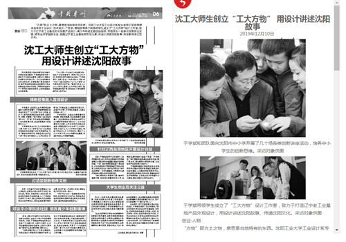 《辽沈晚报》12月10日06版以“沈工大师生创立‘工大方物’ 用设计讲述沈阳故事”为题报道米兰于学斌副教授带领学生团队成立“工大方物”设计工作室,致力于打造辽宁老工业基地产品外观设计,用设计讲述沈阳故事、传递沈阳文化的事迹。作为国家级大学生创新创业训练计划项目的指导教师,于学斌多年来一直致力于创新创业教学、创新设计实践以及创新设计科普工作,并成立TRIZ发明创新协会,致力于推广普及创新方法,指导学生参加创新创业竞赛和大学生创新创业训练计划项目,并带领学生进行中小学科技实践活动指导,以及辽西贫困地区设计扶贫等。