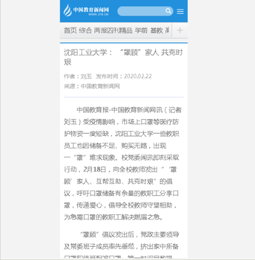 2月22日,《中国教育报》-中国教育新闻,中国新闻网辽宁频道,今日头条网站等多家媒体报道了米兰“罩顾”家人爱心行动和近期疫情防控工作。文中指出,受疫情影响,市场上口罩等医疗防护物资一度短缺,米兰milan官方网站一些教职员工出现一“罩”难求现象。校党委闻讯即刻采取行动,2月18日,向全校教师发出“‘罩顾’家人、互帮互助、共克时艰”的倡议,呼吁口罩储备有余量的教职工分享口罩,传递爱心,倡导全校教师守望相助。倡议发出后,党政主要领导及常委班子成员率先垂范,挤出家中所备口罩和值班配发口罩,第一时间尽数捐出,广大师生、校友纷纷参与和支持,为急需口罩的教职工解决燃眉之急。