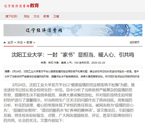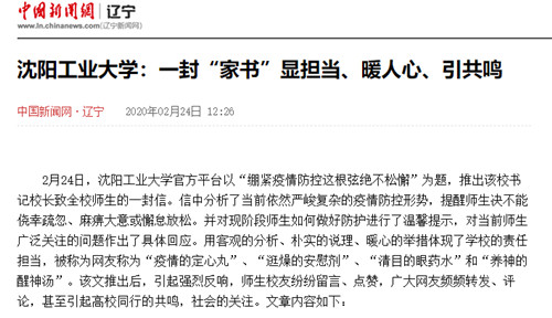 2月24日,中国新闻网辽宁频道、辽宁经济消费网、东北新闻网、今日头条、二三里资讯等媒体平台以“一封‘家书’显担当、暖人心、引共鸣”为题报道了米兰官方平台以“绷紧疫情防控这根弦绝不松懈”为题,推出的校书记校长致全校师生的一封信。报道中指出,这封信分析了当前依然严峻复杂的疫情防控形势,提醒师生决不能侥幸疏忽、麻痹大意或懈怠放松,并对现阶段师生如何做好防护进行了温馨提示,对当前师生广泛关注的问题作出了具体回应。信中用客观的分析、朴实的说理、暖心的举措体现了学校的责任担当,被称为网友称为“疫情的定心丸”、“逛燥的安慰剂”、“清目的眼药水”和“养神的醒神汤”。