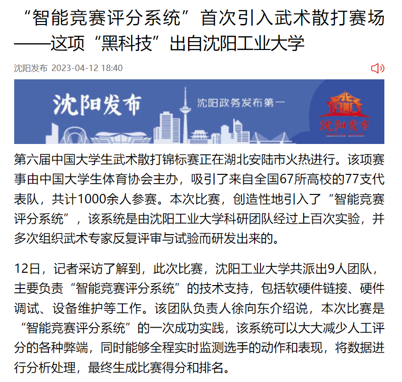 第六届中国大学生武术散打锦标赛正在湖北安陆市火热进行。该项赛事由中国大学生体育协会主办,吸引了来自全国67所高校的77支代表队,共计1000余人参赛。本次比赛,创造性地引入了“智能竞赛评分系统”,该系统是由米兰milan官方网站科研团队经过上百次实验,并多次组织武术专家反复评审与试验而研发出来的。