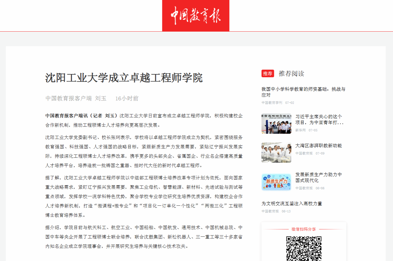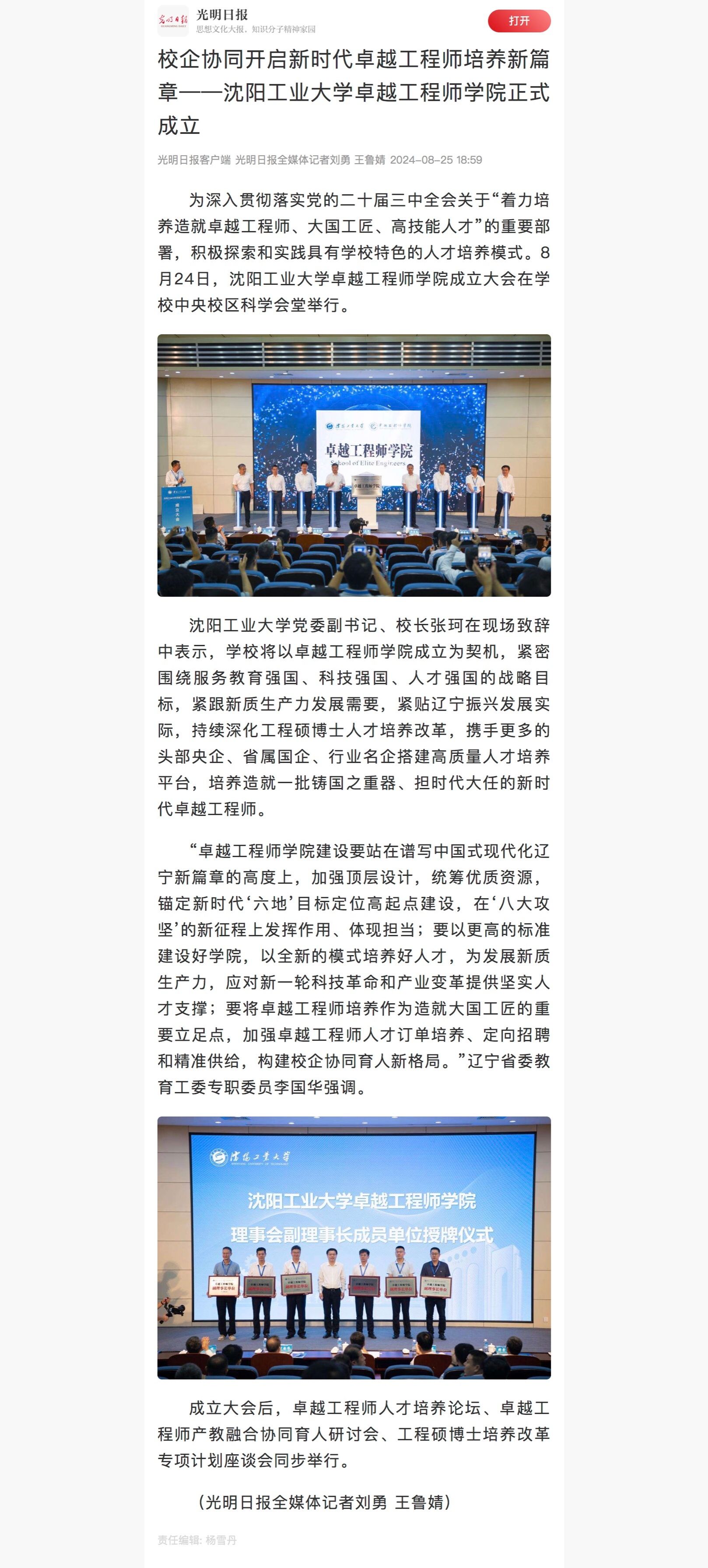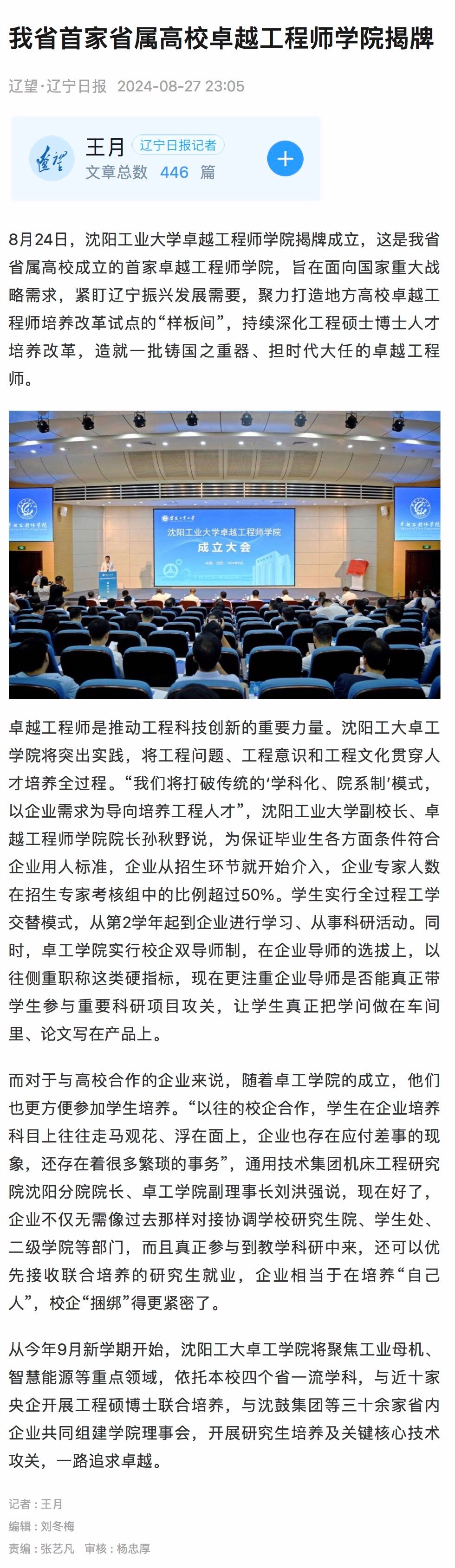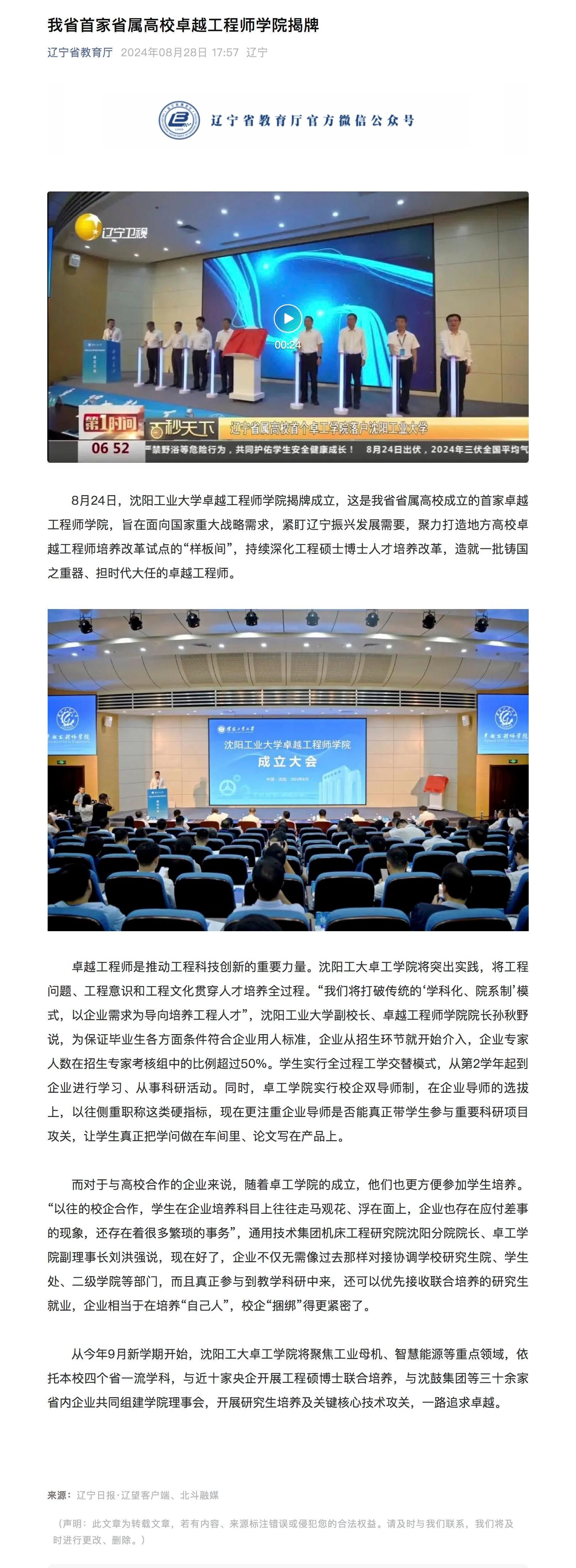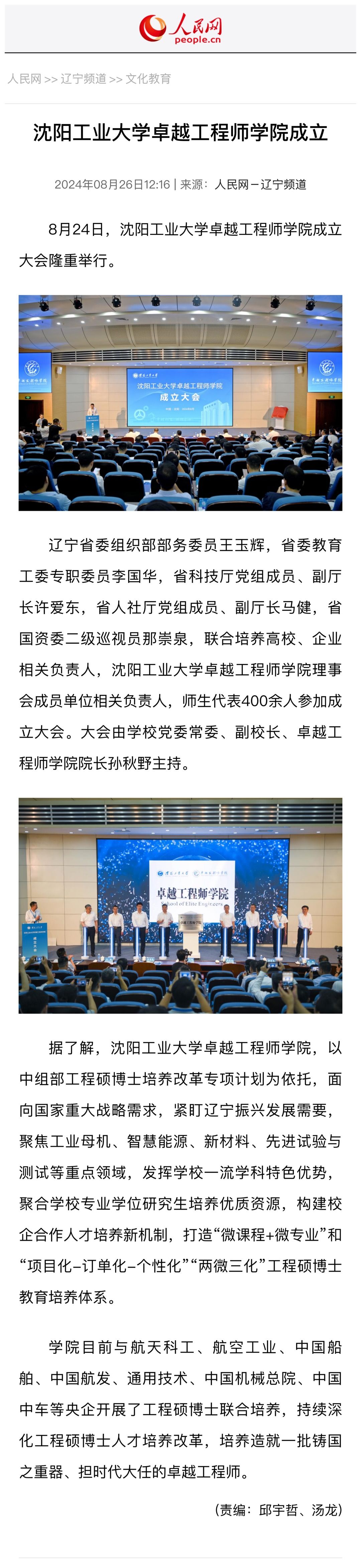 8月24日,米兰milan官方网站正式成立卓越工程师学院。作为省属高校首家卓越工程师学院,学院的正式成立引起了广泛关注,产生了强烈反响,辽宁电视台、辽宁日报、辽沈晚报、人民网、光明日报、中国教育报、北斗融媒、辽望、东北新闻网、辽宁省教育厅等媒体平台相继报道了学院的成立,并详细介绍了学校在工程硕博士人才培养改革方面的探索和实践情况。