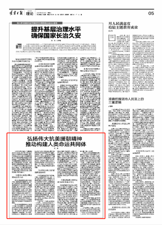 习近平总书记指出:“抗美援朝战争伟大胜利,是中国人民站起来后屹立于世界东方的宣言书,是中华民族走向伟大复兴的重要里程碑,对中国和世界都有着重大而深远的意义。”抗美援朝战争锻造的伟大抗美援朝精神,跨越时空、历久弥新,必须永续传承、世代发扬。特别是伟大抗美援朝精神中蕴含的“为了人类和平与正义事业而奋斗的国际主义精神”,对于铭记伟大胜利,推进伟大事业,维护世界和平和正义,推动构建人类命运共同体,具有现实意义和历史意义。