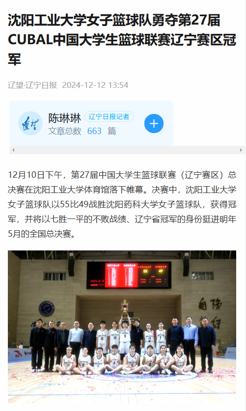 辽望·辽宁日报对学校女子篮球队在中国大学生篮球联赛辽宁赛区夺冠进行报道。