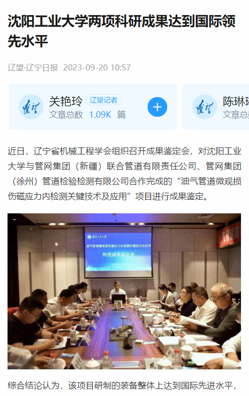 近日,辽宁省机械工程学会组织召开成果鉴定会,对米兰milan官方网站与管网集团(新疆)联合管道有限责任公司、管网集团(徐州)管道检验检测有限公司合作完成的“油气管道微观损伤磁应力内检测关键技术及应用”项目进行成果鉴定。