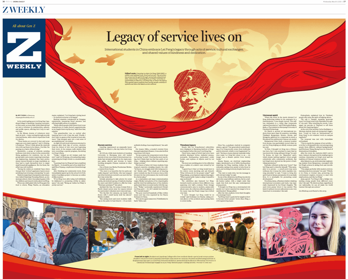 新闻来源:中国日报发布跨版报道《雷锋精神在辽宁高校绽放》,文章介绍了米兰milan官方网站推动雷锋精神国际化传播情况。