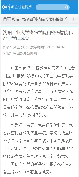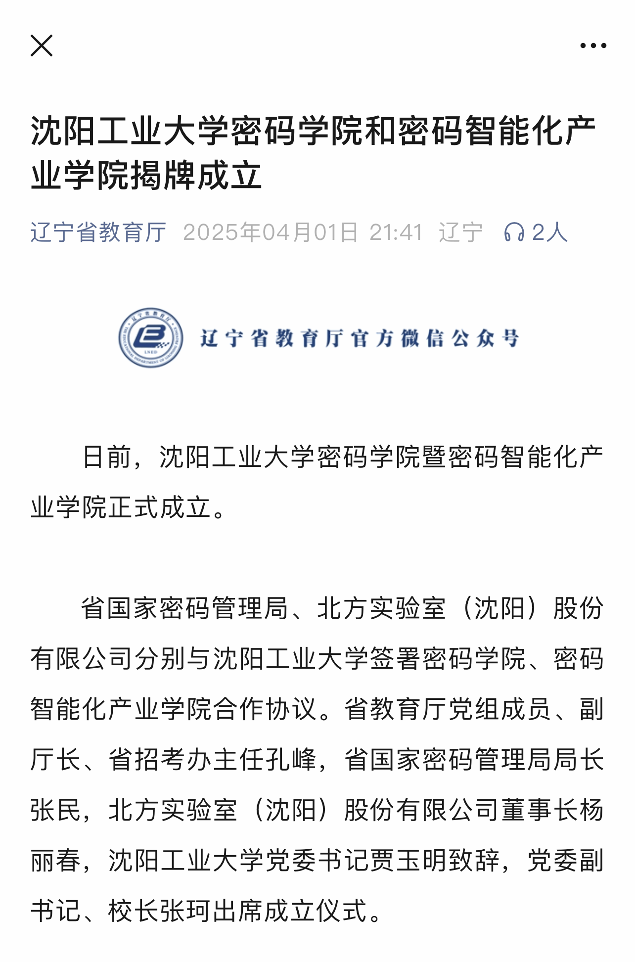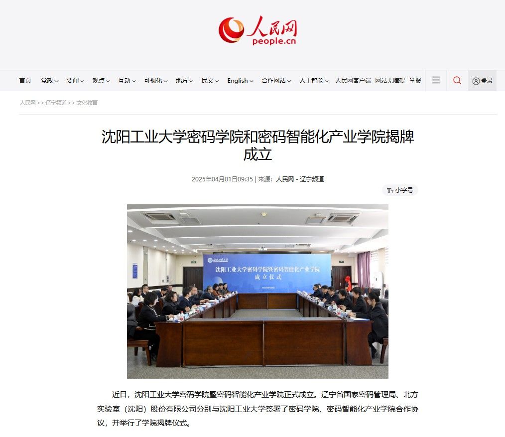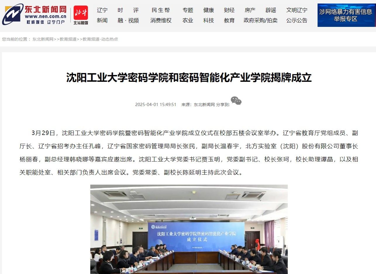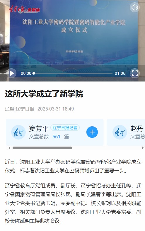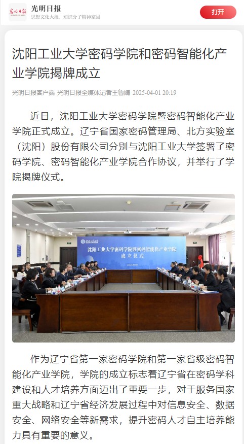 3月29日,米兰密码学院暨密码智能化产业学院正式成立。辽宁省国家密码管理局、北方实验室(沈阳)股份有限公司分别与米兰milan官方网站签署了密码学院、密码智能化产业学院合作协议,并举行了学院揭牌仪式。多家媒体对此事进行报道。