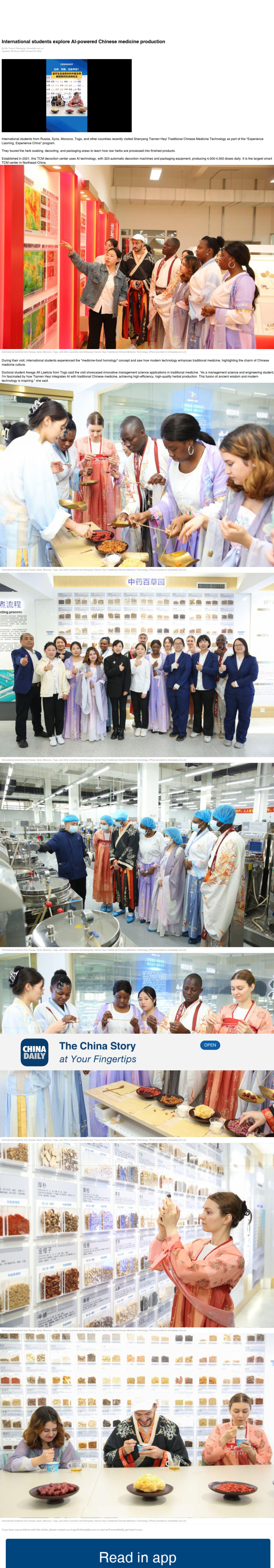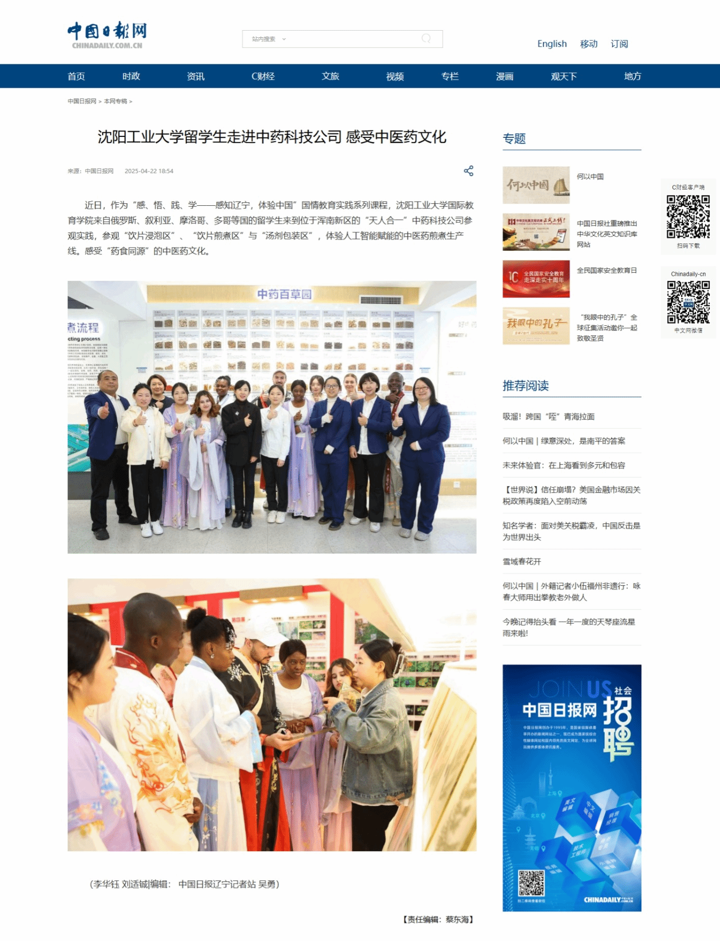 中国日报对米兰milan官方网站国际教育学院来自俄罗斯、叙利亚、摩洛哥、多哥等国的留学生到中药科技公司参观实践进行多角度报道。