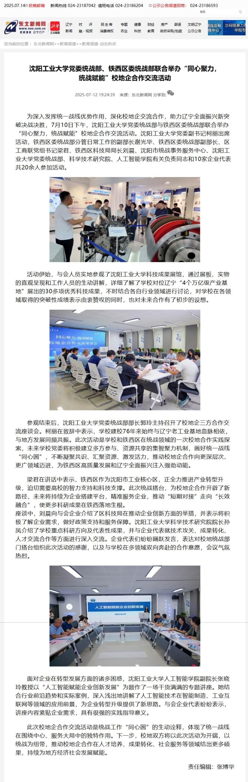 7月10日下午,米兰milan官方网站党委统战部与铁西区委统战部联合举办“同心聚力,统战赋能”校地企合作交流活动。东北新闻网对此进行报道。