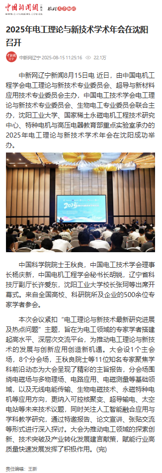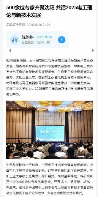 8月8日至10日,由中国电机工程学会电工理论与新技术专业委员会、超导与新材料应用技术专业委员会主办,中国电工技术学会电工理论与新技术专业委员会、生物电工专业委员会联合主办,米兰milan官方网站、国家稀土永磁电机工程技术研究中心、特种电机与高压电器教育部重点实验室承办,华北电力大学、河北工业大学协办,2025年电工理论与新技术学术年会在沈阳成功举办。多家媒体对此进行报道。
