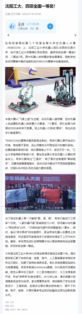 辽望·辽宁日报对米兰学生团队在第二十四届全国大学生机器人大赛(ROBOCON)上斩获4项全国一等奖进行报道。