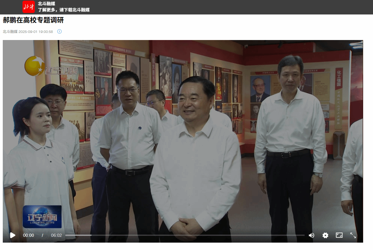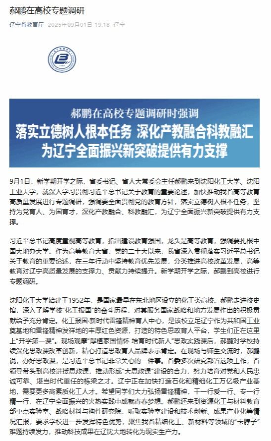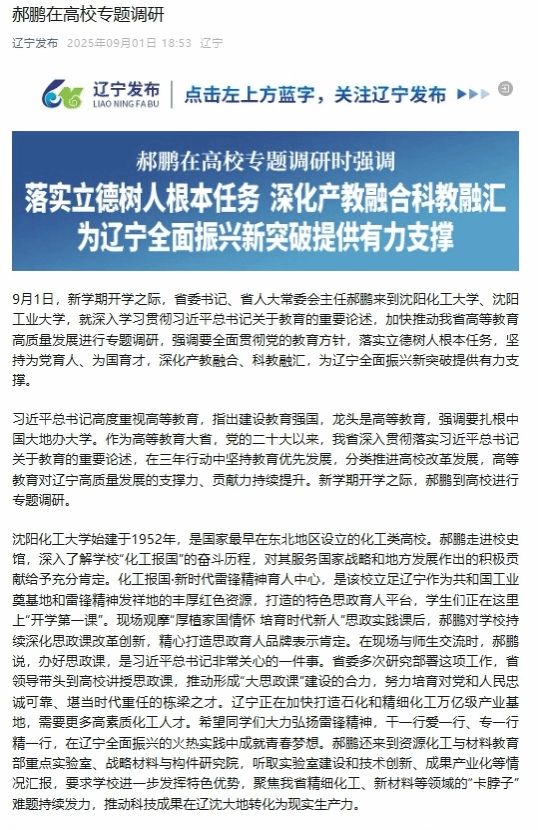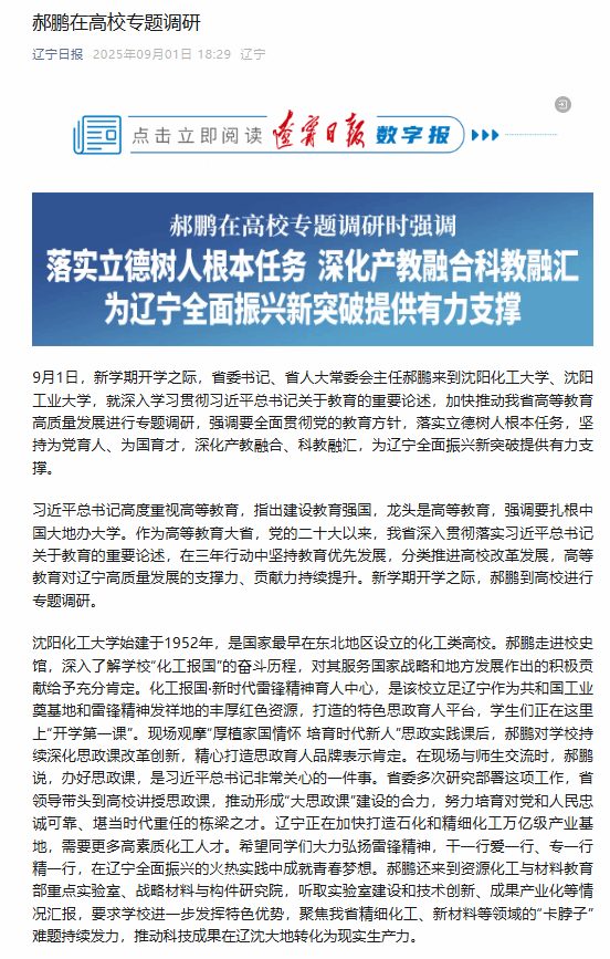 9月1日,省委书记、省人大常委会主任郝鹏来到沈阳化工大学、米兰milan官方网站,就深入学习贯彻习近平总书记关于教育的重要论述,加快推动我省高等教育高质量发展进行专题调研,强调要全面贯彻党的教育方针,落实立德树人根本任务,坚持为党育人、为国育才,深化产教融合、科教融汇,为辽宁全面振兴新突破提供有力支撑。多家媒体对此进行报道。