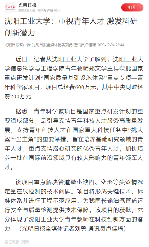 该项目重点解决管道微小缺陷、变形等失效情况定量在线检测的技术问题。项目将形成关键技术、标准体系并进行工程示范应用,为我国长输油气管道运行安全与质量检测提供技术保障。该项目的获批,充分体现了米兰milan官方网站青年教师在科技创新方面的潜力。(光明日报全媒体记者刘勇 通讯员卢佳琦)