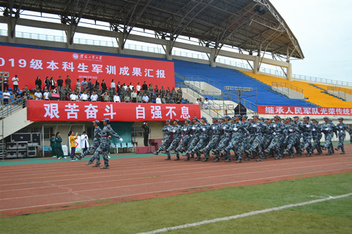 分列式后,进行军训科目汇报表演,有刺杀操、擒敌拳、匕首操、军歌等4个方队的表演。刺杀操表演中,队员们握枪如山,刺枪如电,眼到枪到,威风八面;擒敌拳表演中,队员们如蛟龙出海,猛虎下山,一招制敌,所向披靡;匕首操表演中,工大巾帼,器宇轩昂,展军人本色,卫当代红妆;军歌表演中,队员们以队列动作为基础,在行进间通过各种队列动作的变化组合,依次展现出沈工大校徽、我爱工大字形、红星、党徽、歼20战斗机等,在花样变化中呈现队列之美,全场热烈的掌声不断。军训期间,新生们不仅接受军事化训练,还学习了军事理论等相关内容,进一步丰富和深化了军训教育成果。