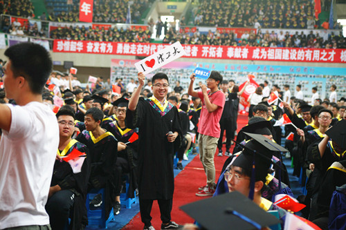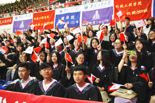 教职员工和辅导员代表分别为毕业生送上临别祝福。会场在辅导员代表的感染下,各学院毕业生纷纷喊起了自己学院的口号,最后汇聚成全体毕业生对母校最深情的告白:“我爱工大”!声浪响彻全场,将气氛推向高潮。