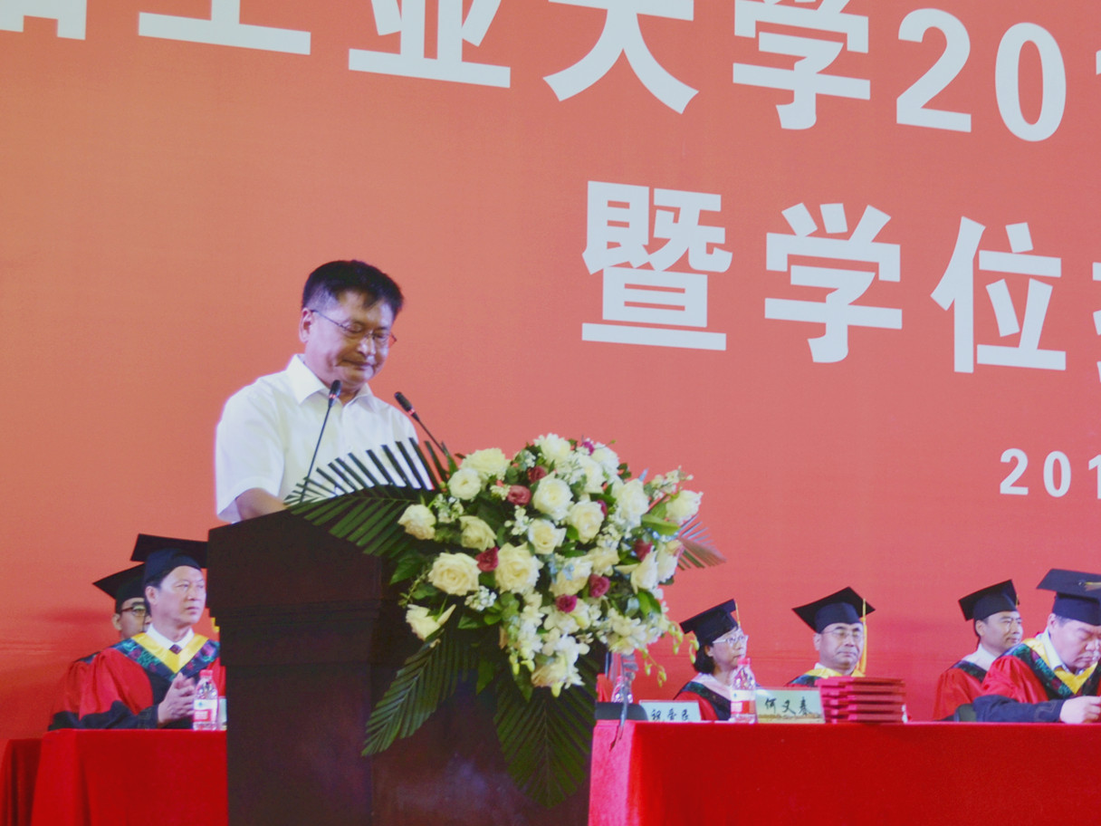 校长、校学位评定委员会主席郭连军为毕业生代表授位,并作了题为《致敬奋斗的青春》的讲话。他向圆满完成学业的毕业生们表示真诚的祝贺,对他们开启新征程表达了美好祝愿。郭连军寄语全体2019届毕业生: