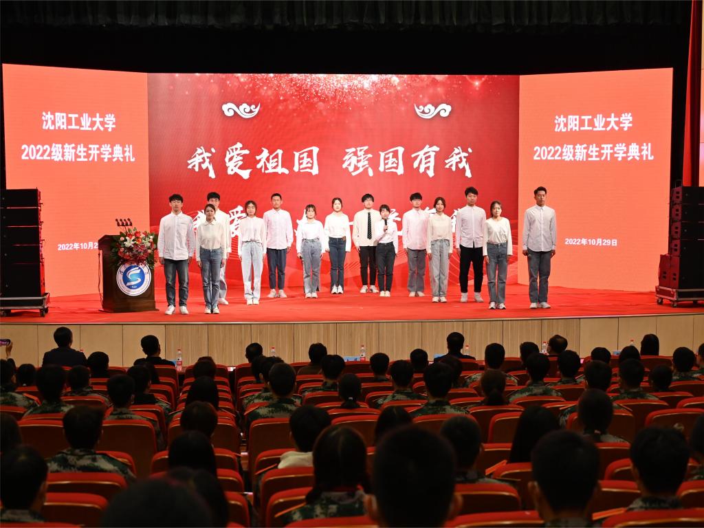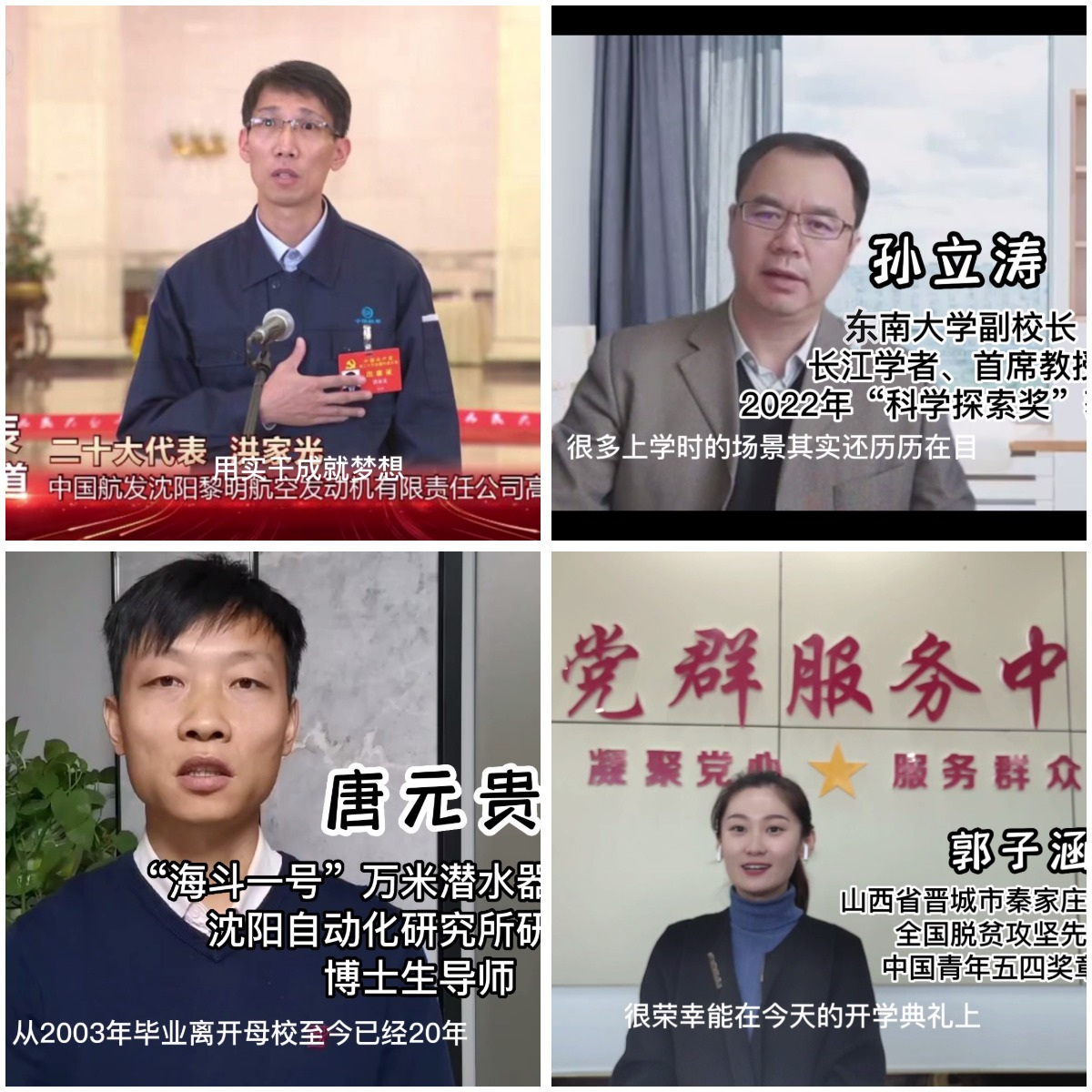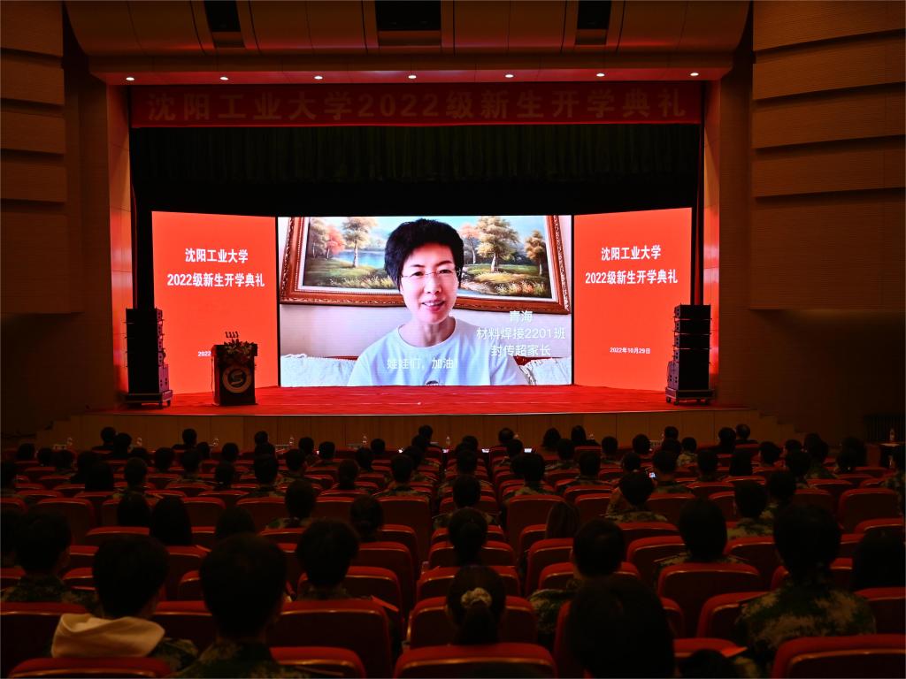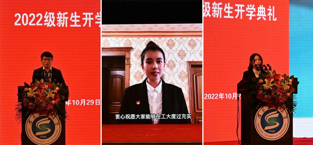 辽宁省教学名师、马克思主义学院院长杨乃坤,2020级硕士研究生阿丽米热、2019级博士研究生孙鹏、2018级本科生牟虹菲分别作为教师代表和在校生代表发言。党的二十大代表洪家光、东南大学副校长孙立涛、“海斗一号”万米潜水器总设计师唐元贵、全国脱贫攻坚先进个人郭子涵代表校友为新生送来祝福视频。来自14个学院的新生代表带来诗朗诵《我爱祖国,强国有我;我爱工大,一流有我》。来自全国31个省、市、自治区的新生家长代表通过视频的方式为学生送上祝福和寄语。典礼现场还举行了校徽佩戴仪式,与会校领导为新生代表庄重地戴上校徽,期待共同书写更精彩的工大华章!