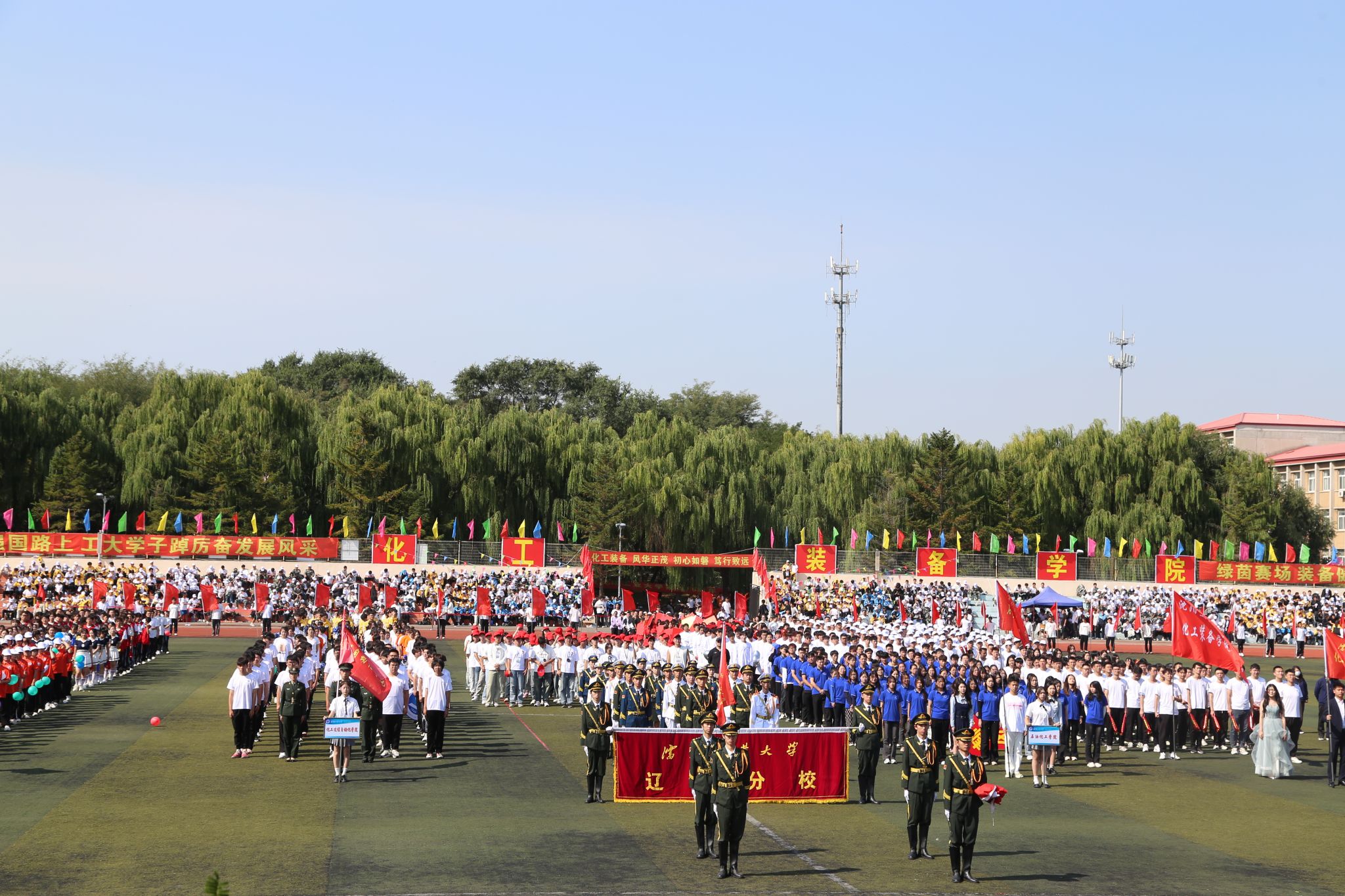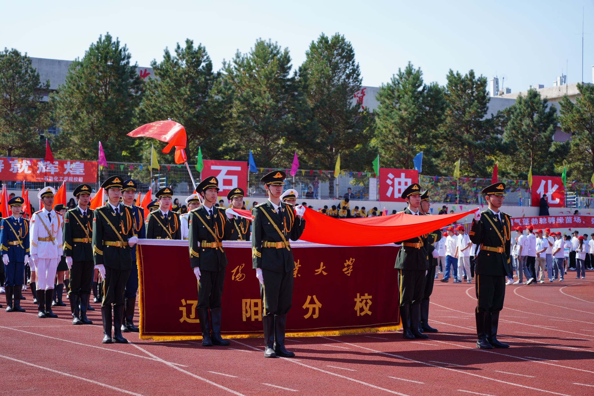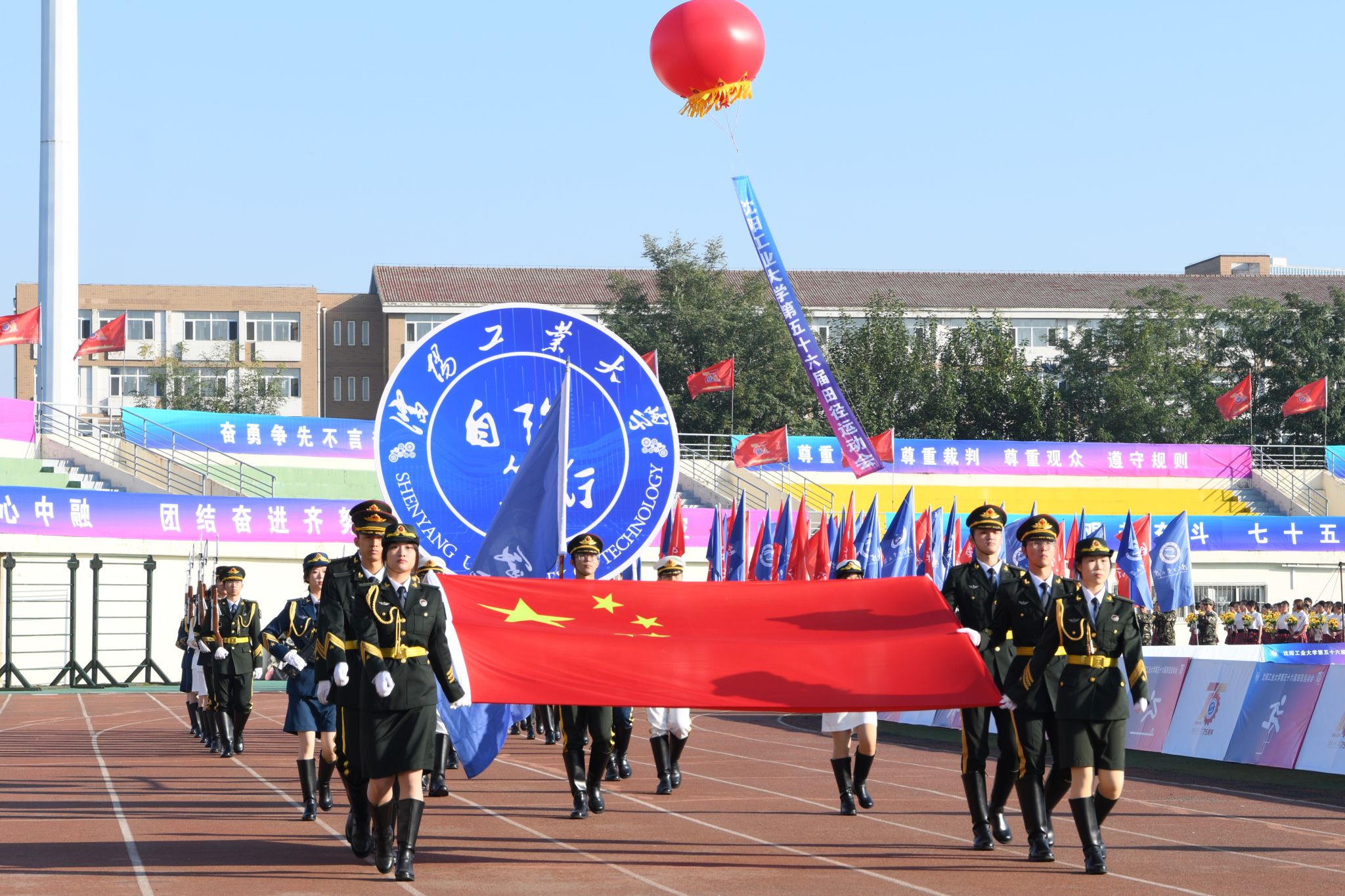 升旗仪式在体育场中举行,五星红旗、校旗在庄严的国歌声和高亢的校歌声中冉冉升起,飘扬在体育场上空。