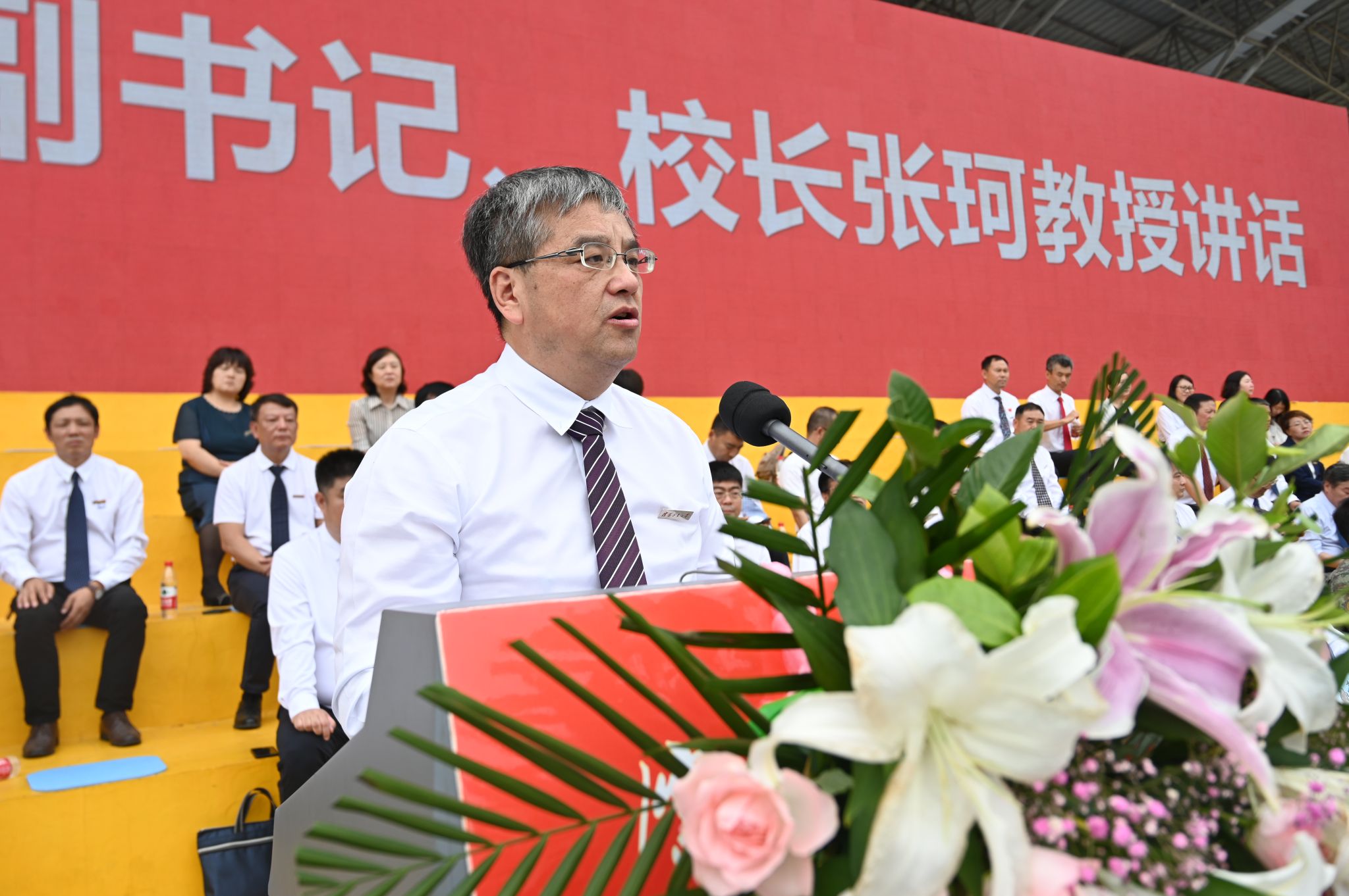 党委副书记、校长张珂作题为《传承工大精神 共赴青春之约》的讲话,代表学校向2023级新同学表示欢迎和祝贺,为同学们通过军训磨砺了意志品质,锻造了优良作风表示骄傲。他介绍了学校的办学历史、文化底蕴和发展成就,希望同学们坚定理想信念,根植工大沃土,厚植家国情怀,勇担时代使命。