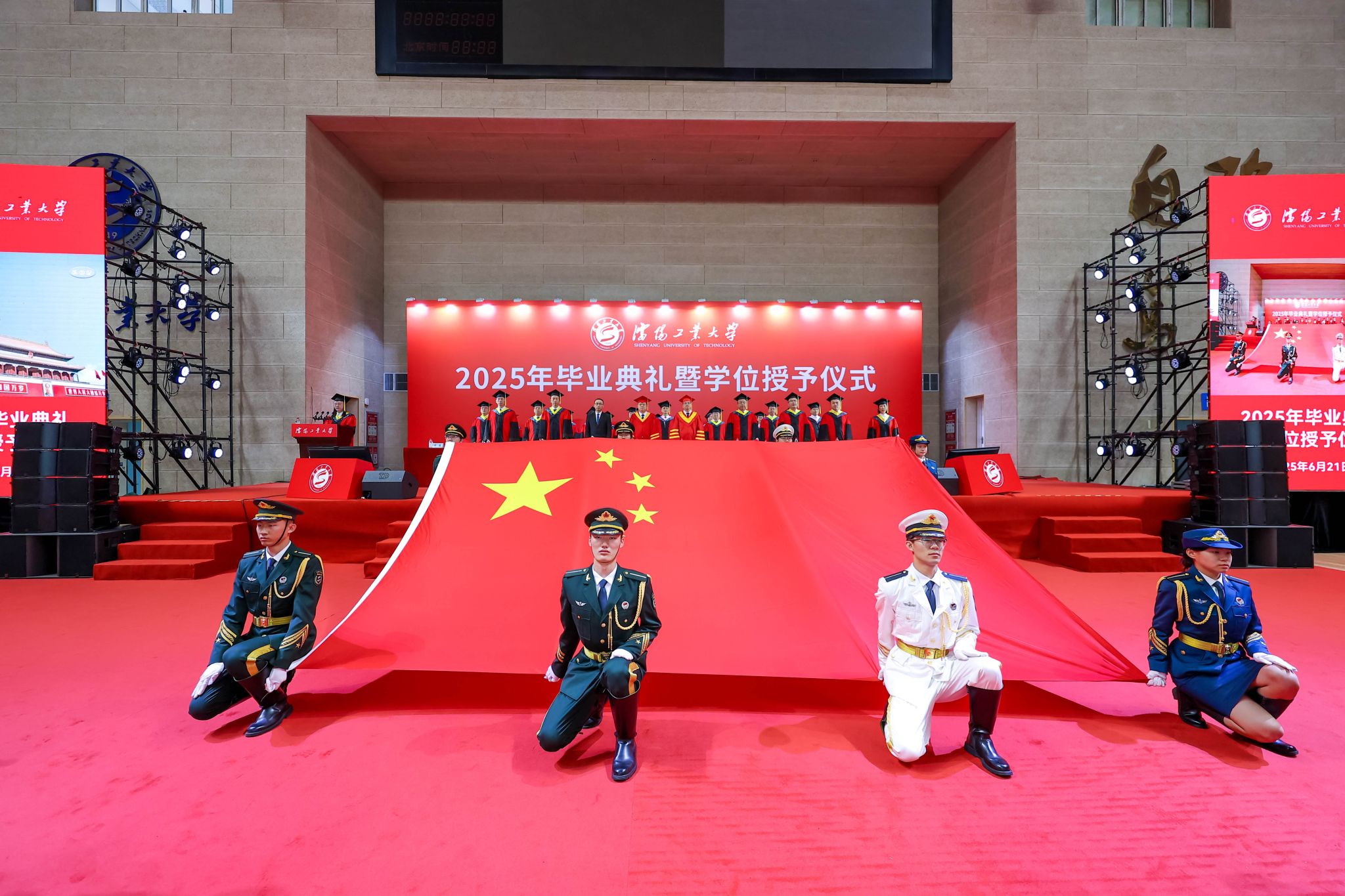 典礼开始,国旗护卫队手持2024年9月21日学校75周年校庆当天,在天安门广场上升起的五星红旗缓缓入场,将新时代赋予工大人的使命和担当传递给即将步入社会的工大学子。